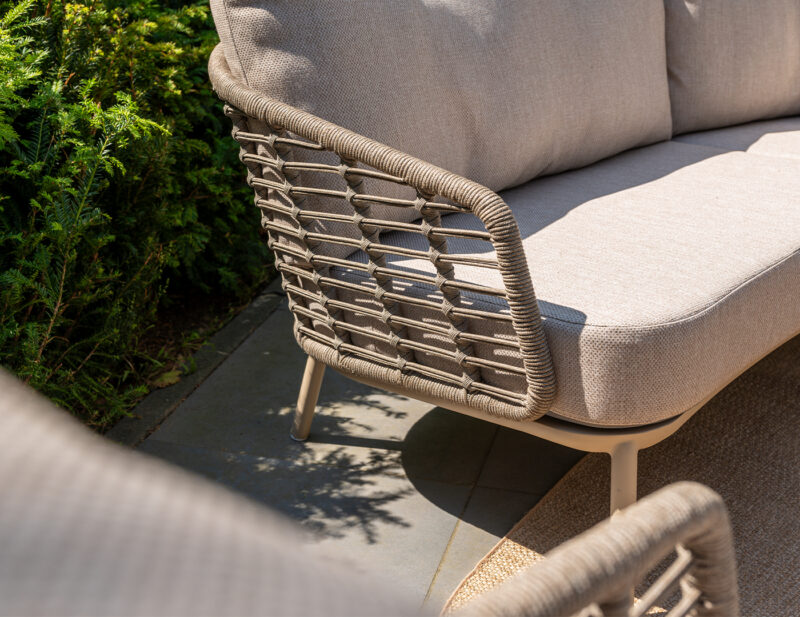 Puglia Demi sedacia súprava kombinuje elegantný dizajn a maximálne pohodlie. Trojsedačka a dve kreslá s rope výpletom dopĺňajú mäkké béžové vankúše. Súpravu uzatvára dvojica dizajnových stolíkov Demi v latte odtieni, ktoré kombinujú keramiku a teak.