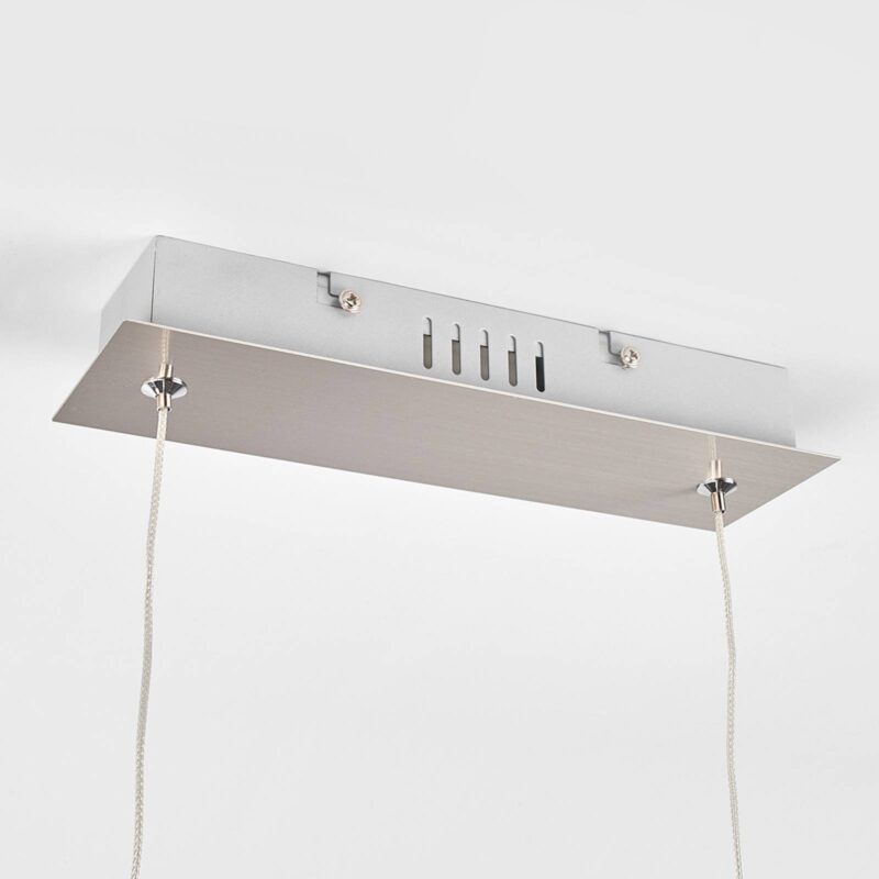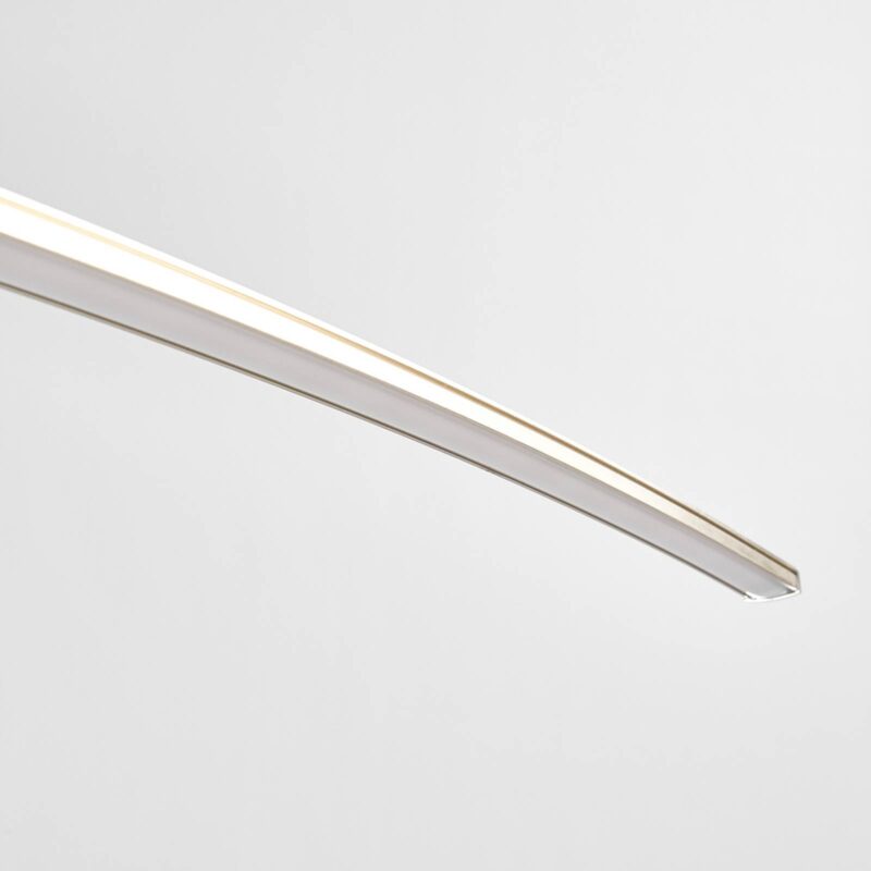 Minimalisticky pôsobiace závesné svietidlo LED Iven v zakrivenom tvare Svetelný prvok Iven je veľmi úzky a na oboch koncoch zahnutý smerom nadol. Svetlo závesného svietidla LED preto uniká smerom nadol a osvetľuje povrch pod ním, v ideálnom prípade stôl. V tomto prípade si možno predstaviť stôl v obývacej časti, ale aj stôl, ktorý slúži ako pracovná plocha v domácej kancelárii. Osvetlenie je dobré vďaka integrovaným LED diódam, spotreba energie zostáva nízka. Kovový povrch striebornej farby má matný niklový povrch a rovnako ako celkový dizajn sa hodí k modernému nábytku.