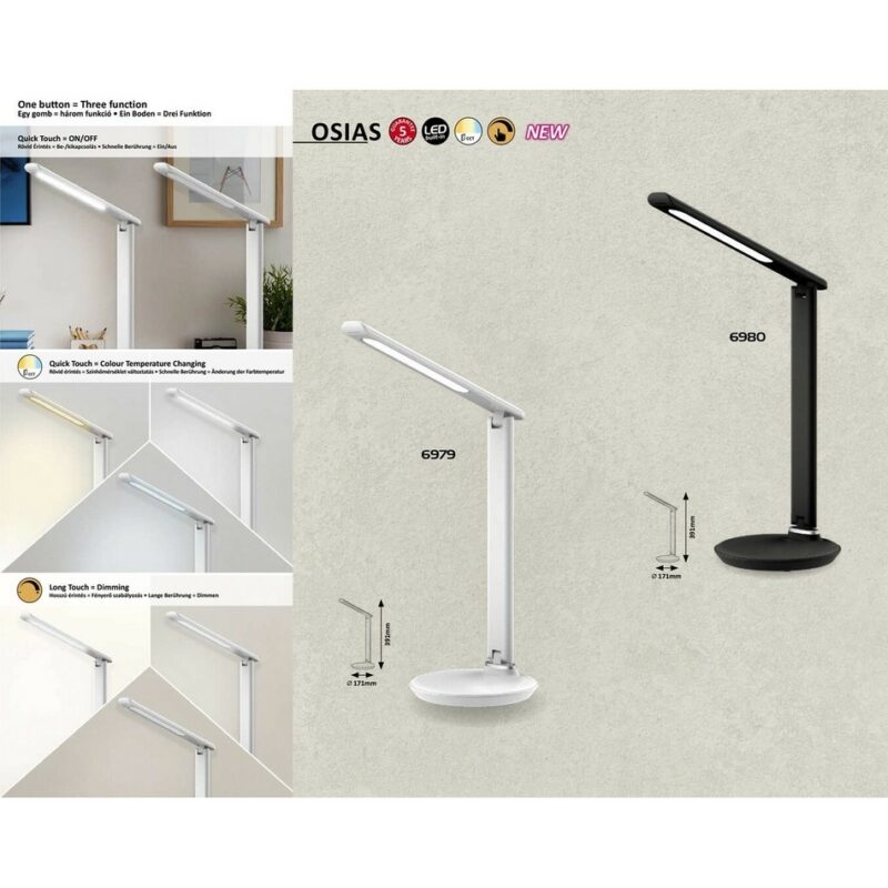 Stolné svietidlo Osias v bielej farbe bude skvelým doplnkom vašej modernej pracovne či pracovného stola v ktorejkoľvek inej miestnosti v domácnosti, kde obvykle čítate, študujete, alebo pracujete na svojom notebooku.Osias má vstavaný LED svetelný zdroj s výkonom 9 W a svetelným tokom 400 lúmenov. Farebnú teplotu svietidla je možné nastaviť v rozmedzí 2700 až 6500 K, tzn. môžete nastaviť teplé, prirodzené alebo studené biele svetlo podľa vašich aktuálnych potrieb. Tento model je navyše možné pomocou vypínača stlmiť v troch krokoch, tzn. zvoliť možno aj jeho jas.Rozmery stolného svietidla Osias vyrobeného z plastu sú: priemer dekoračného podstavca je 171 mm, výška svietidla 391 mm a vzdialenosť od jej stonky 171 mm.
