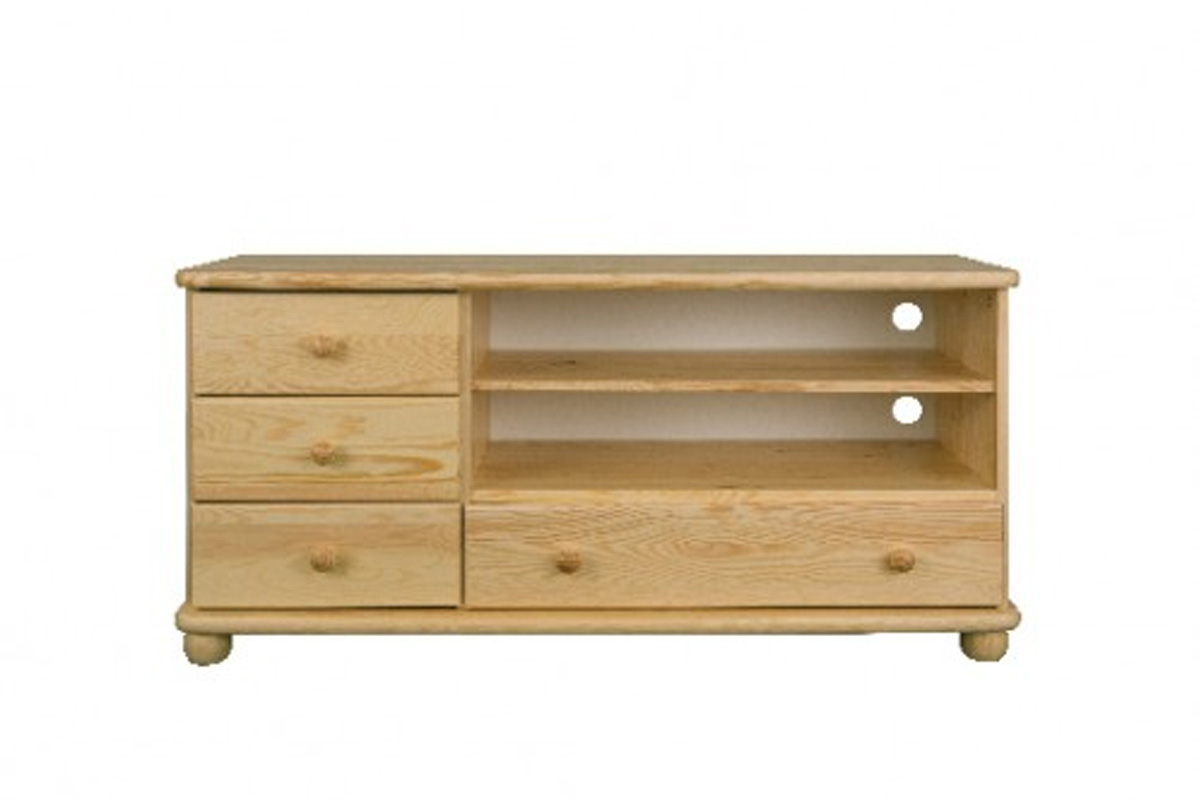 TV stolík RÁCHEL RV127 patrí medzi štýlové drevené výrobky. Je určetné zástancom prírodných materiálov a farieb. V interiéry sa stane dekoračným aj praktickým prvkom a dodá mu teplé tóny. Samozrejmosťou sú kvalitné materiály aj prevedenie. TV stolík ponúka hornú dosku na položenie TV prijímača, 1 otvorenú poličku a 4 šuplíky. V otvorenom priestore sú vytvorené praktické otvory na káble, ktoré uľahčia prístup kú zásuvkám.Nábytok je vyrobený z borovicového masívu v prírodnom farebnom odtieni. Viditeľnosť štruktúry dreva vytvára efektný vzor a spája viacero prírodných odtieňov borovicového masívu. Farba na zakúpenom výrobku môže mať preto odchylky od zobrazenia na fotografii.Rozmery (š/v/h): 124 x 60 x 42 cm. Dodávame v demonte. V našej ponuke aj ďalšie rozmery TV stolíka.