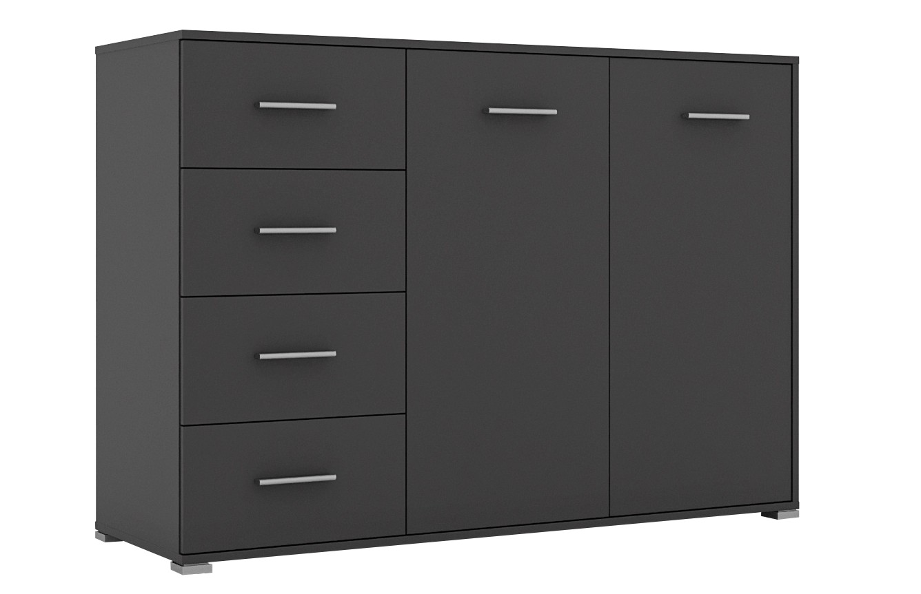Kombinovaná komoda RADAN 2D4S je funkčný a moderný nábytok vhodný do každého interiéru. Táto komoda je vyrobená z LTD laminovaného materiálu. Farba grafit dodáva komode príjemný a elegantný vzhľad. Komoda disponuje dvoma dvierkami za ktorými sú dve police a štyrmi zásuvkami.Rozmery komody: Š135 / V95 / H45 cm. Podrobné rozmery v nákrese.Súčasťou sú aj uchytky, ktoré umožňujú pohodlné otváranie a zatváranie dverí a zásuviek. Táto kombinovaná komoda je skvelou voľbou pre tých, ktorí hľadajú praktický a moderný nábytok do svojho obývacieho priestoru.Komoda je dodávaná v demonte, čo umožňuje jednoduchú montáž doma.