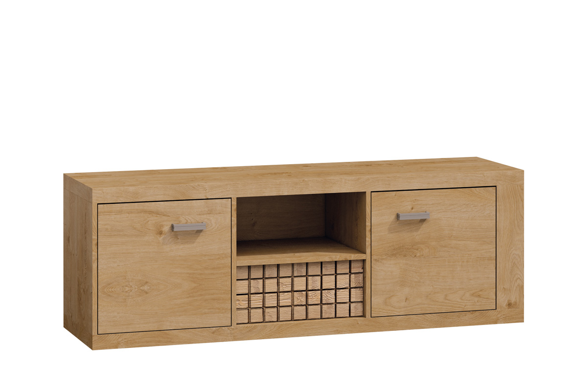 Štýlový TV stolík RANDER so zaujímavým dekórom, dokáže upútať na prvý pohľad. Netradičné dekoračné prvky z prírodného dreva dodávajú tomuto nábytku výnimočný vzhľad. Zaujímavé detaily oslovia aj najnáročnejších zákazníkov. Úchyty majú jemný dekór (viď detail).TV stolík je rozdelený na 3 časti. Krajové ponúkajú dvierka s 1 vnútornou poličkou, v strede nájdete 1 otvorenú poličku a šuplík. Nábytok je vyrobený v kombinácii kvalitnej LTD dosky, ktorá nie je náročná na údržbu, dýhy s drevenou štuktúrou a masívnym drevom. Farebné prevedenie je v prírodných teplých tónoch ribbeck. Ku komode máte možnosť dokúpiť si efektné LED osvetlenie.Rozmery (š/v/h): 150,5 x 40,5 x 51 cm. Dodávame v demonte.V rovnakom dizajnovom a farebnom prevedení ponúkame aj ďalšie prvky sektoru RANDER ako aj obývaciu zostavu RANDER.