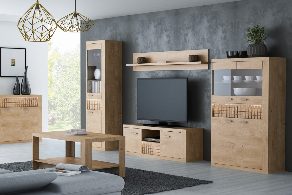 Štýlová obývacia zostava RANDER so zaujímavým dekórom, dokáže upútať na prvý pohľad. Netradičné dekoračné prvky z prírodného dreva dodávajú tomuto nábytku výnimočný vzhľad. Zaujímavé detaily oslovia aj najnáročnejších zákazníkov. Úchyty majú jemný dekór (viď detail).Nábytok je vyrobený v kombinácii viacerých materiálov. Kvalitnej LTD dosky, ktorá nie je náročná na údržbu, dýhy s drevenou štuktúrou a masívnym drevom. Farebné prevedenie: ribbeck.Ku zostave máte možnosť dokúpiť si efektné LED osvetlenie.Súčasťou zostavy sú:- štvordverová vitrínová skrinka N5 s 2 vnútornými poličkami. Ku vitríne si môžete doobjednať LED osvetlenie dekorovaného pásu aj LED osvetlenie sklenenej poličky. Rozmery (š/v/h): 102 x 159,5 x 40,5 cm.- TV stolík N12 s 2 dvierkami, s možnosťou doobjednať LED osvetlenie dekorovaného pásu. Rozmery (š/v/h): 150,5 x 51 x 40,5 cm.- polička. Rozmery (š/v/h): 120 x 32 x 18 cm.- vysoká vitrína N4 s 3 vnútornými poličkami.Ku vitríne si môžete doobjednať LED osvetlenie dekorovaného pásu aj LED osvetlenie sklenenej poličky. Rozmery (š/v/h): 57 x 200,5 x 40,5 cm. Široká komoda a konferenčný stolík nie sú súčasťou zostavy. Môžete si ich doobjednať samostatne.Dodávame v demonte