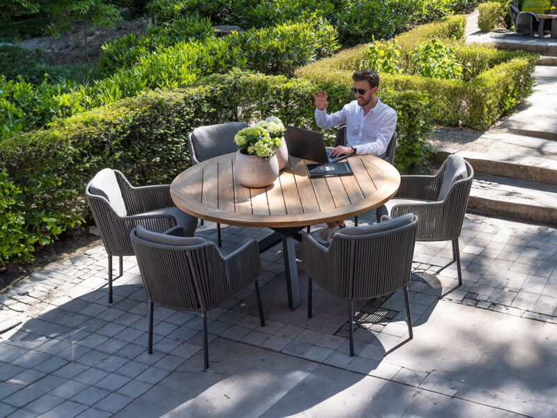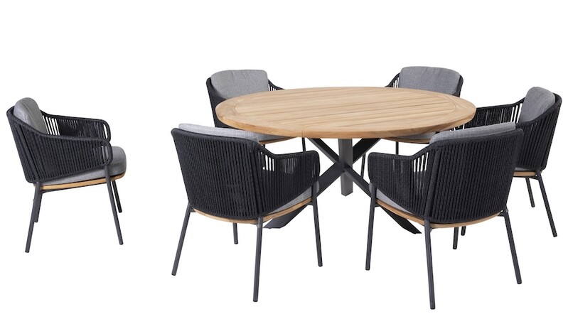 Jedinečná stolová súprava Ravello ll s nadčasovým dizajnom vyrobená z odolných materiálov zapadne do každého exteriéru.