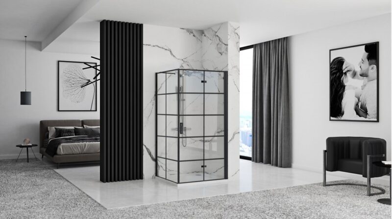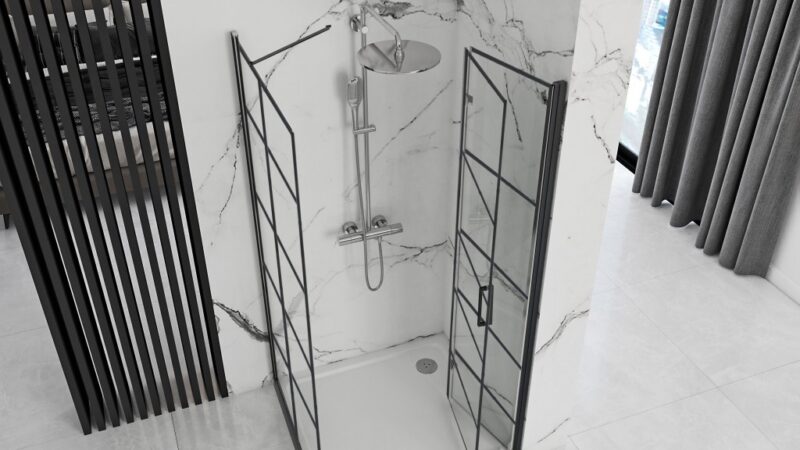Sprchový kút z tvrdeného skla s dekorom vytvoreným pomocou špeciálnej farby sa skladá z dverí šírky 80 cm so zalamovacou funkciou a pevnou bočnou 90 cm stenou. Súčasťou zásteny je rohová vzpera.