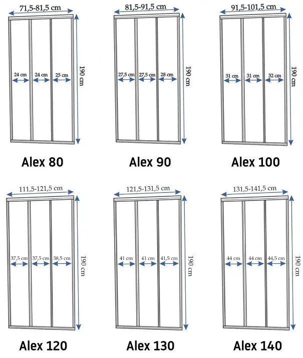 Sprchové dvere Alex predstavujú dokonalú kombináciu estetiky kúpeľne a pohodlia pri kúpaní. Sú vyrobené z najkvalitnejšieho tvrdeného skla a majú modernú povrchovú úpravu EasyClean. Dvere Alex sa skladajú z jedného pevného a dvoch posuvných prvkov. Otváranie dverí je pravotočivé. Pre zmenu smeru dverí na ľavotočivý treba vyskrutkovať zvislé profily v koncovom pohyblivom prvku s vyčnievajúcou lištou v podobe kľučky a profily posunúť na druhú stranu skla. CAD(GT) Ean: 5906366007514