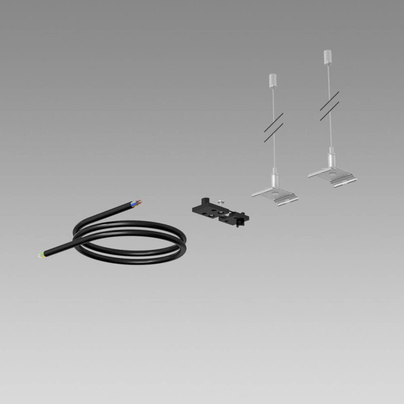Závesná súprava pre stropné svietidlo Purelite Táto závesná súprava je určená na použitie lamelového svietidla Purelite ako závesného svietidla. Súčasťou dodávky závesnej súpravy je držiak oceľového lana so samosvorným mechanizmom, ako aj dve oceľové laná (pripínateľné) s 2 m priehľadným prívodným káblom vrátane odľahčenia ťahu. – Odporúčanie pre montáž: každých 1,5 m – Nosnosť: max. 20 kg