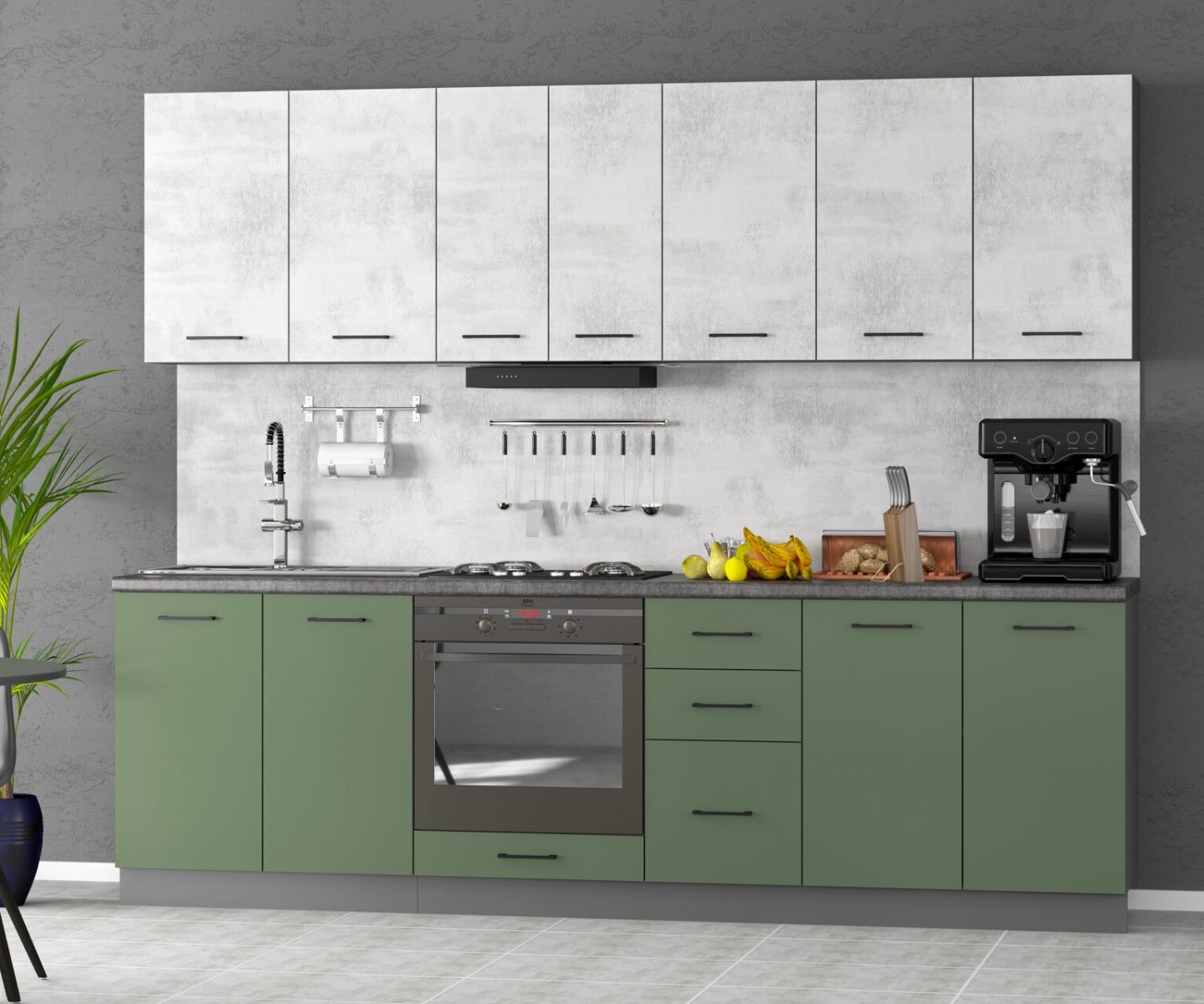 Štýlová kuchynská zostava RENÁTA 260 je efektívnym a cenovo dostupným riešením pre každú kuchyňu. Vďaka rozmeru 260 cm poskytuje dostatok úložného priestoru, je vyrobená z kvalitnej LTD dosky. Farebné prevedenie dymová zelená + svetlý betón vytvára príjemný farebný kontrast s čiernymi kovovými úchytmi. Korpus kuchyne je vo farbe grafit.Kuchynská zostava obsahuje:dolné skrinky:drezová skrinka 80cmskrinka pod vstavanú rúru 60cmskrinka s 3 zásuvkami 40cmdvojdverová skrinka 80cmhorné skrinky:dvojdverová skrinka 80cmdvojdverová skrinka 60cmjednodverová skrinka 40cmdvojdverová skrinka 80cmDoplňujúce informácie:Výška dolných skriniek je 82 cm, hĺbka je 44,5 cm.Výška horných skriniek je 72 cm a hĺbka je 28,5 cm.Spotrebiče, pracovná doska ani umývadlo nie sú súčasťou kuchyne. Je potrebné ich dokúpiť.Kuchyňu je možné zakúpiť iba ako zostavu.Dodávame v demonte.