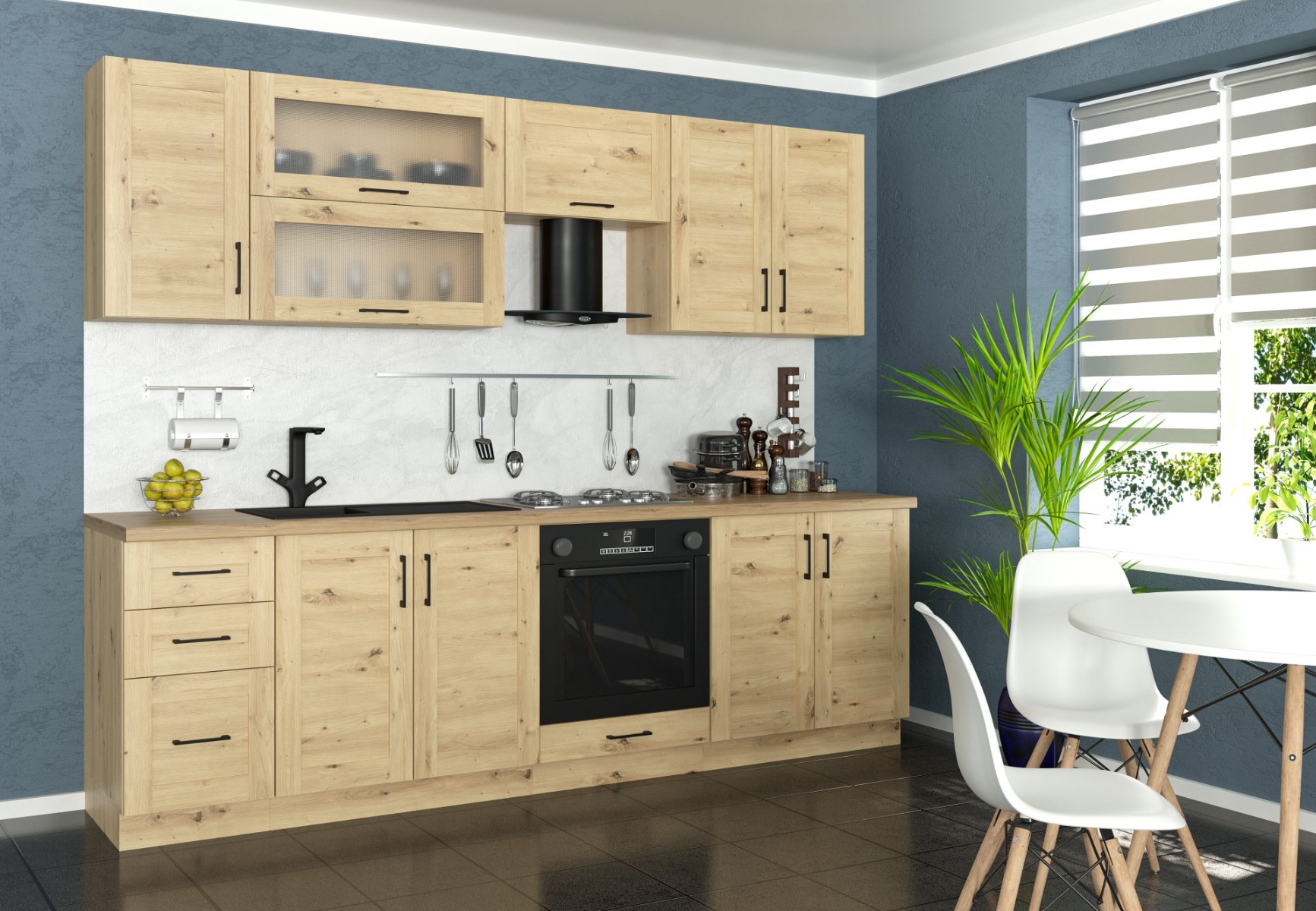 Praktická kuchynská zostava RENÁTA je efektívnym a cenovo dostupným riešením pre každú kuchyňu. Vďaka rozmeru 260 cm poskytuje dostatok úložného priestoru, je vyrobená z kvalitnej LTD dosky. Farebné prevedenie dub artisan vytvára príjemný farebný kontrast s čiernymi kovovými úchytmi.Výška dolných skriniek je 82 cm, hĺbka je 44,5 cm.Výška horných skriniek je 72 cm a hĺbka je 28,5 cm.Kuchynská zostava obsahuje:dolné skrinkyskrinka so zásuvkami 40cmdrezová skrinka 80cmskrinka pod vstavanú rúru 60cmdvojdverová skrinka 80cmhorné skrinkyjednodverová skrinka 40cmdvojdverová výklopná skrinka 80cmdigestorová skrinka 60cmdvojdverová skrinka 80cmSúčasťou kuchyne je spodný sokel. Spotrebiče, pracovná doska ani umývadlo nie sú súčasťou kuchyne. Je potrebné ich dokúpiť.Kuchyňu je možné zakúpiť iba ako zostavu.Dodávame v demonte.