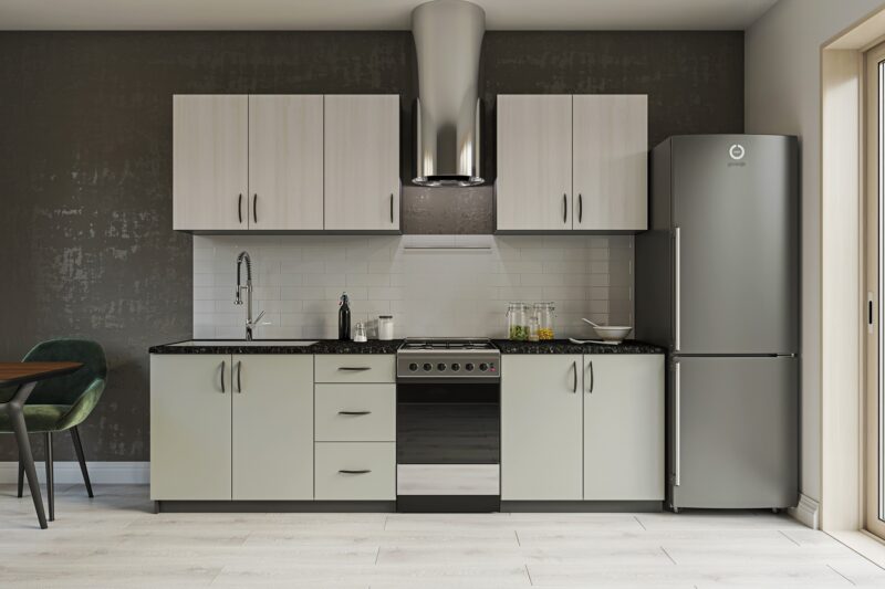 Moderná kuchyňa Rene vás zaujme svojim praktickým a zároveň štýlovým prevedením. Je vhodná do moderných interiérov. Disponuje množstvom úložného priestoru.Výška horných skriniek: 72 cm. Hĺbka: 30/32 cm. Výška dolných skriniek: 82 cm. Hĺbka: 46 cm.Sokel nie je v cene zostavy.Rozmery zostavy (š,h): 200 x 48 cm.Kuchynské skrinky sú vyrobené z kvalitných LTD dosiek. Ich údržba je nenáročná. Korpus je vo farbe grafit. Dvierka sú vo farbe ash surfside / chinchilla grey. Úchyty sú plastové, v čiernej farbe.Horné skrinky majú v cene regulovateľné závesy. Ku každej hornej skrinke sa zároveň dodávajú 2 ks 10 cm závesnej lišty. Nedelenú závesnú lištu pre jednoduchšiu montáž je možné doobjednať.Kuchynská zostava je zložená z týchto prvkov:2x horná skrinka 80/72 cm, horná skrinka 40/72 cm, dolná skrinka 80/82 cm, dolná drezová skrinka 80/82 cm, dolná skrinka 40/82 cmDrez a pracovnú dosku je potrebné dokúpiť.Spotrebiče nie sú súčasťou kuchynskej linky.Kuchyňu je možné zakúpiť len ako zostavu.Dodávame v demontovanom stave.