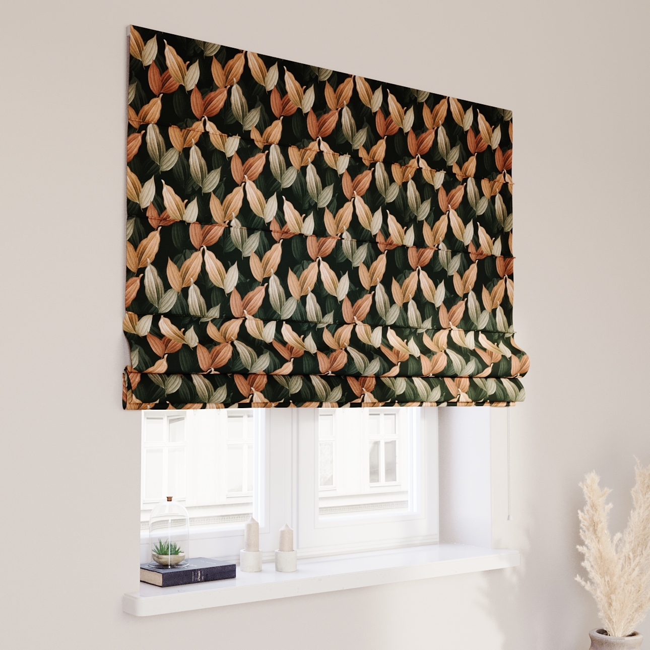 Rímska roleta Capri, borskyňovo – hnedé listy na čiernom pozadí, Abigail, 143-21