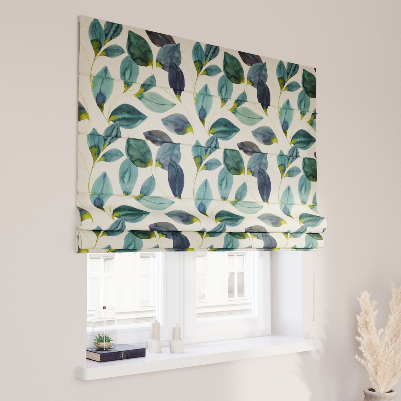 Rímska roleta Capri, smaragdovo – zelené listy s fialovým nádychom na plátne, Abigail, 143-15