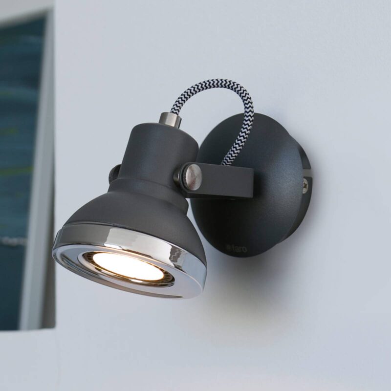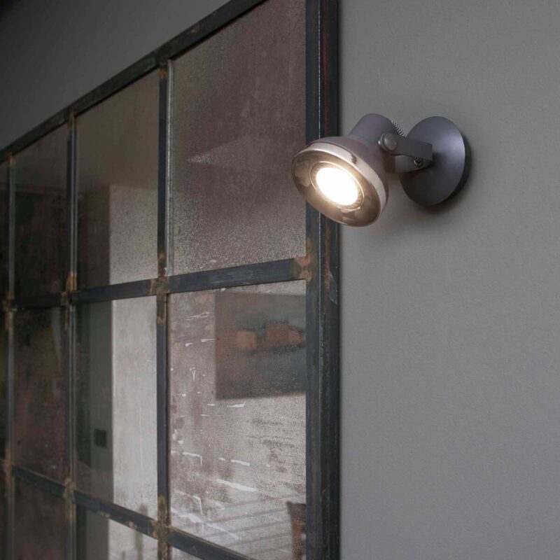 Nástenné LED svietidlo Ring nalakované tmavosivou farbou v retro štýle Okrúhle nástenné svietidlo Ring s objímkou GU10 pre LED žiarovky s výkonom do 8 wattov je univerzálne použiteľné v akomkoľvek obytnom priestore. Či už ako svietidlo nad čelom postele v spálni alebo ako cielené náladové osvetlenie – svietidlo v retro dizajne sa postará o všeobecný rozruch. Pochrómované detaily sú obzvlášť nápadné.