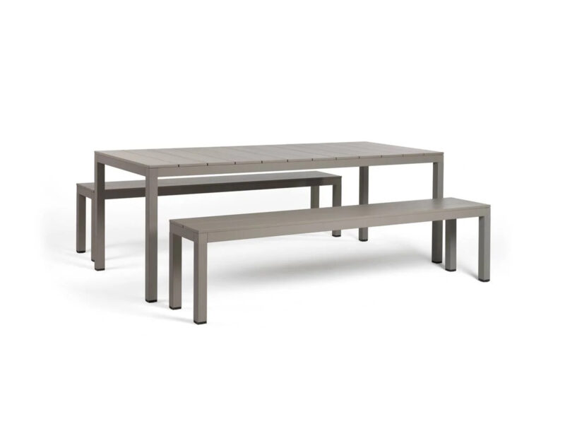 Exkluzívny záhradný lavicový set Rio Alu od talianskej značky Nardi, navrhnutý Raffaellom Galiottom, kombinuje eleganciu, odolný lakovaný hliník a moderný dizajn pre štýlové a pohodlné vonkajšie posedenie.