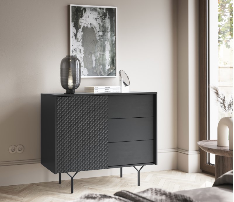 Dizajnový sektor RIVONA dodá Vašej obývacej miestnosti štýl. Pri výrobe sú použité najnovšie trendy v dizajne nábytku a kvalitný materiál. Nábytok je vyrobený z 16mm MDF dosky odolnej voči poškriabaniu. Všetky hrany sektoru sú chránené ABS páskou.Moderná a štýlová komoda Rivona má 3 praktické zásuvky a dvierka za ktorými je jedna polica, kde si môžete uložiť všetky potrebné veci. Disponuje bezúchytovým otváraním dverí, systémom push to open. Moderné nožičky nábytku sú vyrobené z kovu v čiernej farbe.Materiál: MDF doska, predné čelá s 3D efektomRozmer(ŠxVxH) 97 x 83 x 38 cm Farebné prevedenie : čierny grafitDodávame v demonte.