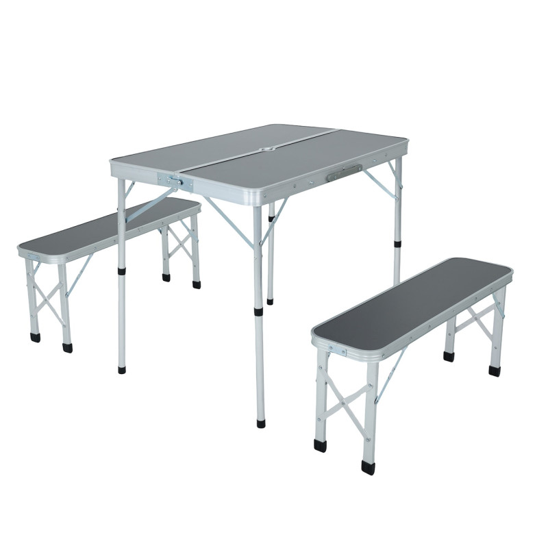 Zostava turistického nábytku ROBI pozostáva zo stola a dvoch ladiacich lavíc. Každý prvok je možné zložiť, vďaka čomu sa súprava kempingového nábytku ľahko a pohodlne prenáša. Stôl a lavice sú dostatočne veľké na pohodlné usadenie 4 osôb. Stôl , ktorý je súčasťou súpravy, má veľkú dosku, na ktorú môžete ľahko umiestniť riad, príbor, misku so šalátom alebo občerstvenie. Doska stola aj sedáky lavice sú vyrobené zo 4 mm hrubých MDF dosiek, navyše vystužených hliníkovým rámom. Vďaka tomu je nábytok veľmi odolný a odolný voči zaťaženiu. Tento turistický set ROBI má hliníkový rám, ktorý sa vyznačuje vysokou odolnosťou a nízkou hmotnosťou. Kvalitná konštrukcia bezpečne odolá veľkému zaťaženiu, nepriaznivým poveternostným podmienkam a dokonca aj kontaktu s vlhkosťou a vodou. Vďaka tomu sada kempingového nábytku ROBI dobre funguje v rôznych podmienkach a zachováva si svoje funkčné hodnoty aj pri častom používaní.Rozmery:Dĺžka stola: 90 cmŠírka stola: 60 cmVýška stola: 109 cmHĺbka sedadla: 23 cmŠírka sedadla: 87 cmVýška sedadla: 38 cmŠpecifikácia:Materiál: hliník / MDFCelková hmotnosť: 11 kgHmotnosť produktu: 9,5 kgFarebné prevedenie: sivé