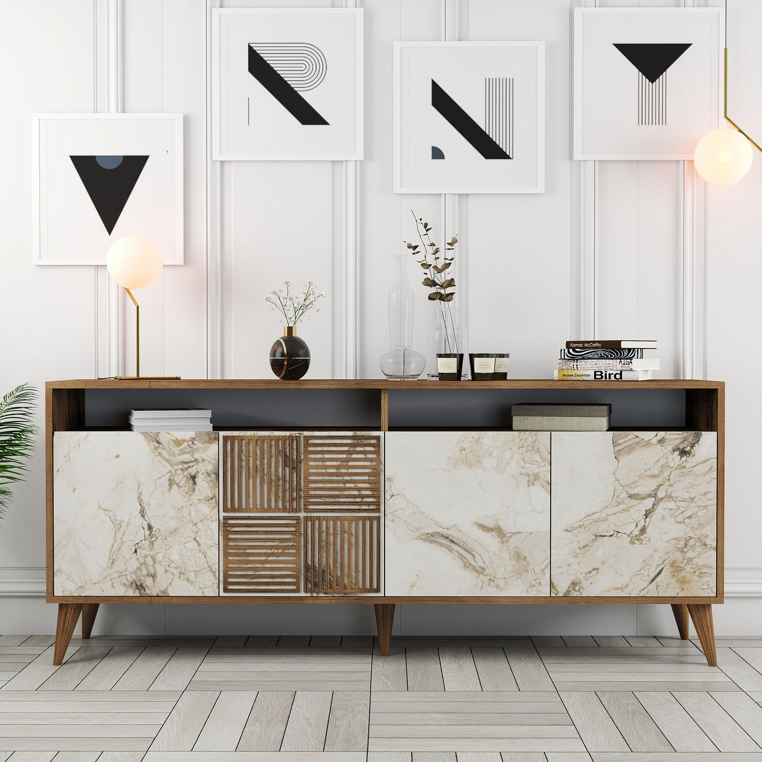 ROMA štvordverová komoda, orech/biely mramor