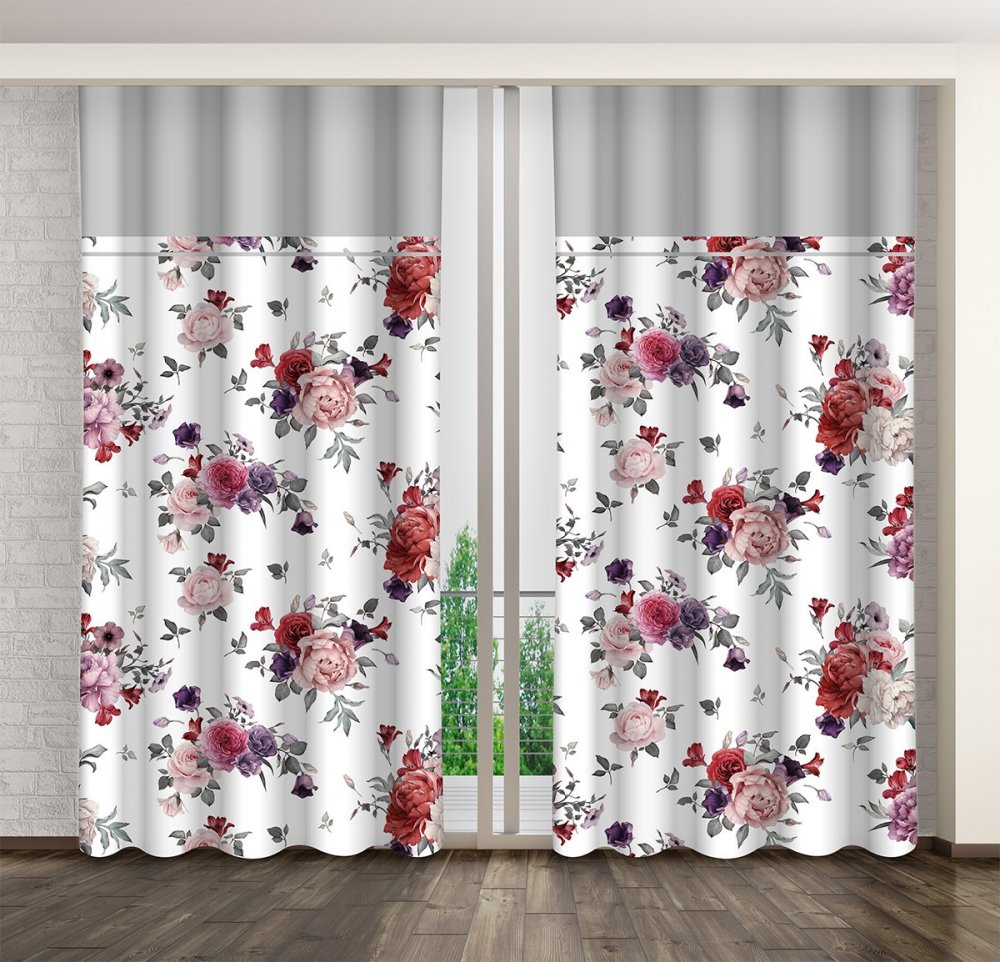 Romantický biely záves s potlačou ruží a šedým lemom Šírka: 140 cm | Dĺžka: 270 cm