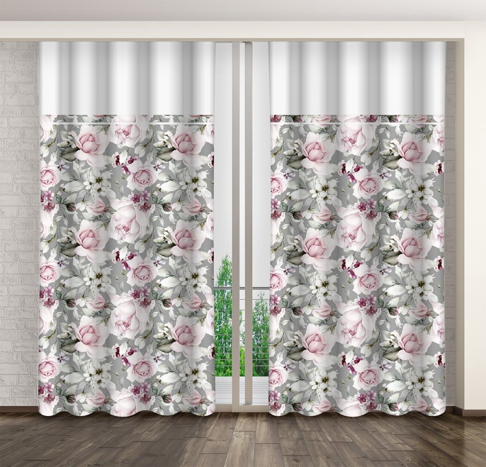 Romantický šedý záves s potlačou ruží s bielym lemom Dĺžka: 250 cm