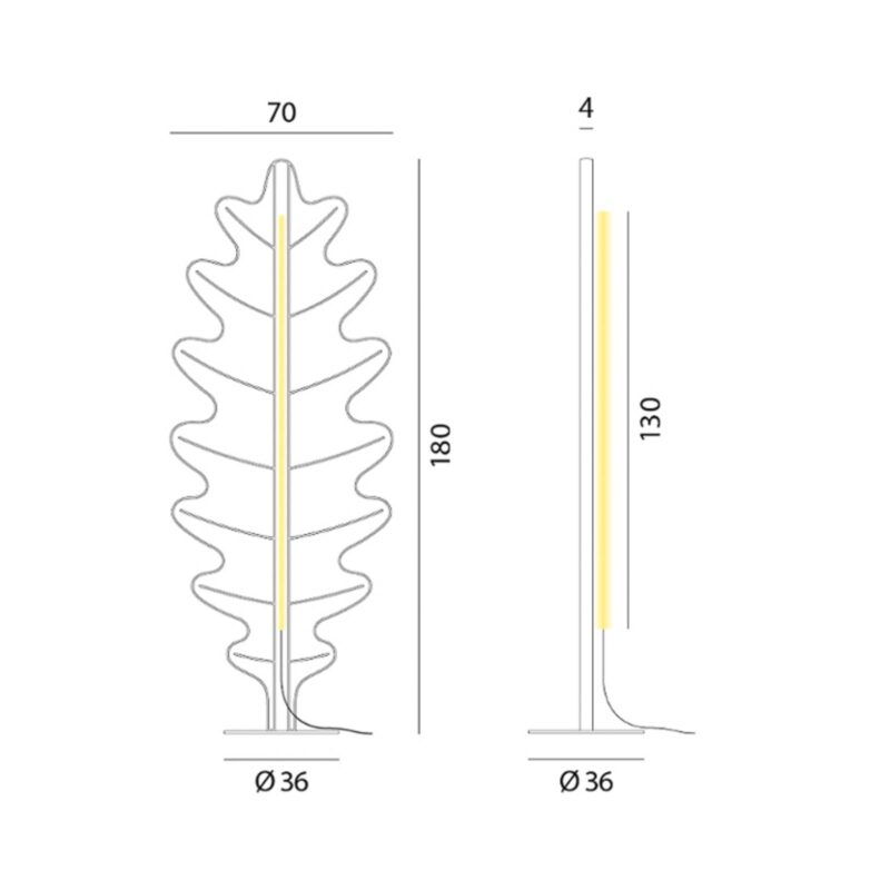 Stmievateľné LED dizajnové stojaca lampa z kolekcie Eden v tvare dubového listu Motívom talianskych dizajnérov Giovanniho Laudu a Danteho Doneganiho v koncepcii tejto stojaca lampa bolo vytvorenie priestorového raja pohody. Tyč so svetelnými zdrojmi LED zaisťuje útulnú atmosféru vďaka farbe a jasu teplého bieleho farba svetla, ktoré je možné nastaviť pomocou dotykového stmievača. K tomu prispieva aj textilné telo, ktorého vlastnosti pohlcovania zvuku majú rozhodujúci vplyv na akustiku miestnosti. Magneticky pripevnenú tyč LED je možné v prípade potreby demontovať, čím sa z Duba stane čistý dizajnový objekt. Bez ohľadu na svoju funkciu – stojaca lampa v tvare nadrozmerného dubového listu je dokonalým pútačom pozornosti pre moderné a kvalitné obývacie izby a salóniky.
