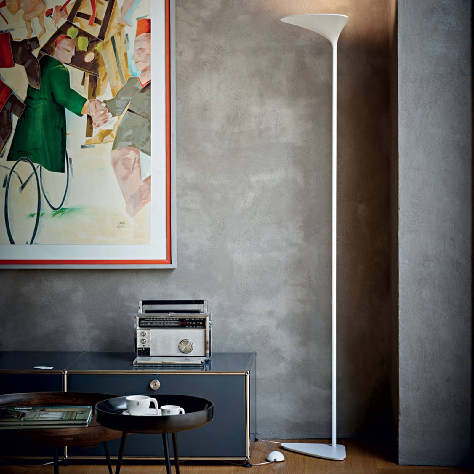 Stojacia lampa Sunset LED – nepriame osvetlenie v čistom tvare a farbe Moderný dizajn stojacej lampy Sunset LED zaujme čistým vzhľadom a atmosférickým osvetlením. Je vyrobená z hliníka a celá sa dodáva v matnej bielej farbe, vďaka čomu je harmonickým a nenápadným doplnkom najmä moderných obytných priestorov. Zakrivené tienidlo je vrcholom tejto stojacej lampy a zaplavuje steny mäkkým, teplým bielym svetlom. Nepriame vyžarovanie svetla vytvára príjemnú atmosféru a rozptýlené osvetlenie miestnosti, ktoré kladie akcenty. Praktický nožný stmievač, ktorý je integrovaný na kábli, umožňuje jednoducho nastaviť jas svetla a prispôsobiť ho situácii podľa potreby. Vďaka vysokému indexu podania farieb poskytuje Sunset mimoriadne prirodzené svetlo a sýte farby. Autorom návrhu tohto svietidla je Paolo Dell’Elce, ktorý ho vytvoril pre taliansku dizajnovú spoločnosť Rotaliana. Je produktovým špecialistom na nábytok a osvetlenie a od roku 2015 vedie tím nábytkového dizajnu v Miláne. Jeho práca bola publikovaná na medzinárodnej úrovni a získala ocenenia a uznania vrátane ceny Red Dot Award.