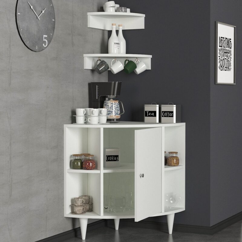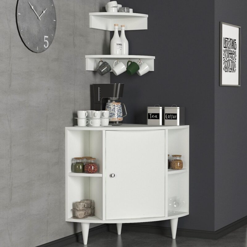 Netradičná štýlová rohová skrinka/stolík ROXEN bude svelým doplnkom Vašej kuchyne či jedálne v prípade ak ste vlastníkov kávovaru a túžite po svojom kávovom kútiku. Ponúka bohatý úložný priestor ktorý určite oceníte a vďaka štýlovým tvarovaným nožičkám bude ozdobou každej domácnosti. Skvelým bonusom sú aj rohové závesné police v cene, ktoré vyplnia prázdny priestor nad skrinkou a sú ideálne na vystavenie dizajnových čajových súprav. Tento moderný kúsok nábytku Vám budú všetci závidieť.Materiál: kvalitné 18 mm LTD hranené PVC páskouFarebné prevedenie: biela matnáRozmery: š 61 x h 60,5 x v 75 cmDodávame v demonte.