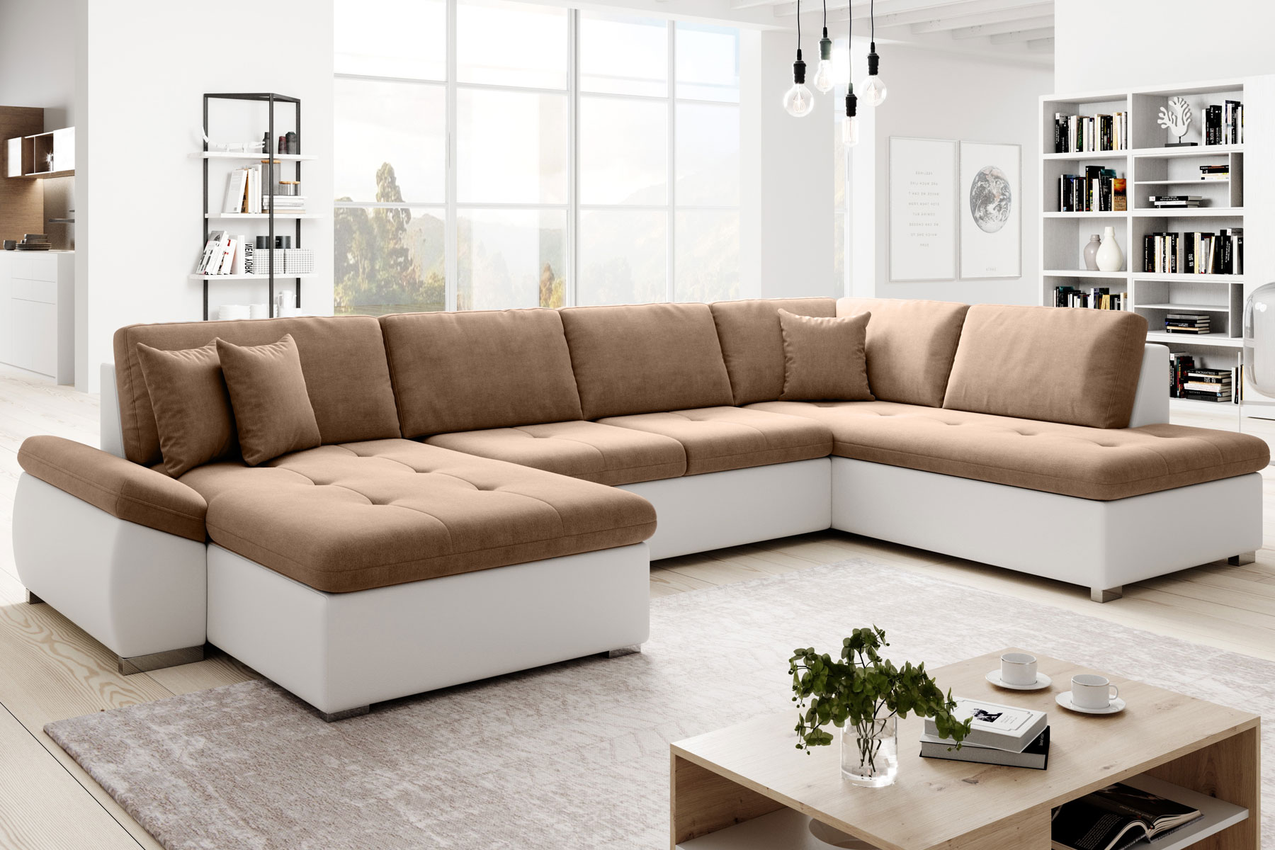 Účková sedačka MADUAR U Vás hneď upúta svojím dizajnom. Sedačka je v kombinácií ekokoža a látka. Nožičky sú pochrómované. Sedačka má aj funkciu rozkladu, po rozložení vznikne plocha 285 x 135 cm, ktorá je vhodná na príležitostné spanie.Sedačka MADUAR U je vyrobená v kombinácií vlnovcovej pružiny a PUR peny s hustotou T-30.Rozmery (ŠxVxH) : 355 x 76 x 205/162 cm. Výška sediska od zeme je 41 cm. Výška sedačky bez vankúšov je 65 cm. Hĺbka sediska po vankúše je 48 cm , bez vankúšov 63 cm.Farebné prevedenie : Madryt 120/ Sofia 07Prevedenie rohu : pravéPoťahová látka MADRYT je označovaná ako ekokoža, jedná sa o kvalitnú imitáciu kože. Vrchná strana textílie je tvorená 100% polyuretánom, ktorý je veľmi pružný, flexibilný a mäkký. Starostlivosť je jednoduchá, stačí utrieť navlhčenou handričkou, prípadne použiť špeciálne prostriedky na čalúnenie.Poťahová látka SOFIA je vyrobená zo 100% polyesterových vlákien. Je veľmi mäkká, príjemná na dotyk a odolná voči poškodeniu a roztiahnutiu. Klasickým znakom je prešitie rôznymi tónmi niťou v rovnakej farbe tkaniny čím získava netradičný vzhľad. Odporúčame čistiť neagresívnymi prípravkami pre čalúnený nábytok a jemné hubky.Sedačka sa skladá z troch balíkov :204 x 75 x 89 cm – 54 kg157 x 75 x 98 – 49 kg135 x 75 x 94 – 54 kgDodávame v demonte.Farebné prevedenie sa môže líšiť v závislosti od nastavenia Vášho PC monitora alebo telefónu.