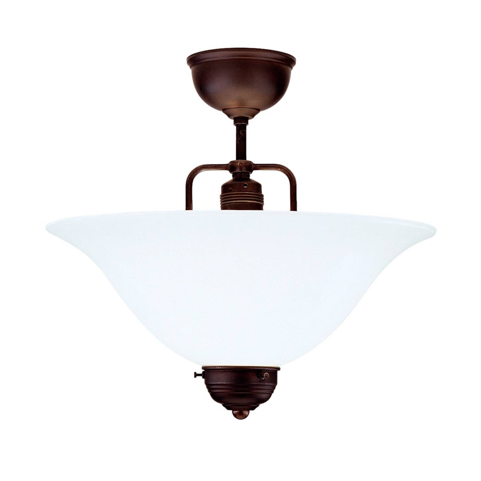 Elegantné stropné svietidlo ROSA so skleneným tienidlomStropné svietidlo ROSA s bielym tienidlom ponúka nenápadnú, ale dostatočne veľkú možnosť osvetlenia. Tienidlo má nielen priemer 30 cm, ale zaujme aj svojou výškou. Rám, ktorý žiari mierne industriálnym šarmom, je vyrobený z mosadze a vďaka zafarbeniu patinou získal starožitné zafarbenie bez toho, aby ho bolo potrebné natierať. Okrem klamlivo originálneho výsledku z hľadiska farby je výhodou aj to, že povrch sa veľmi ľahko čistí suchou handričkou.