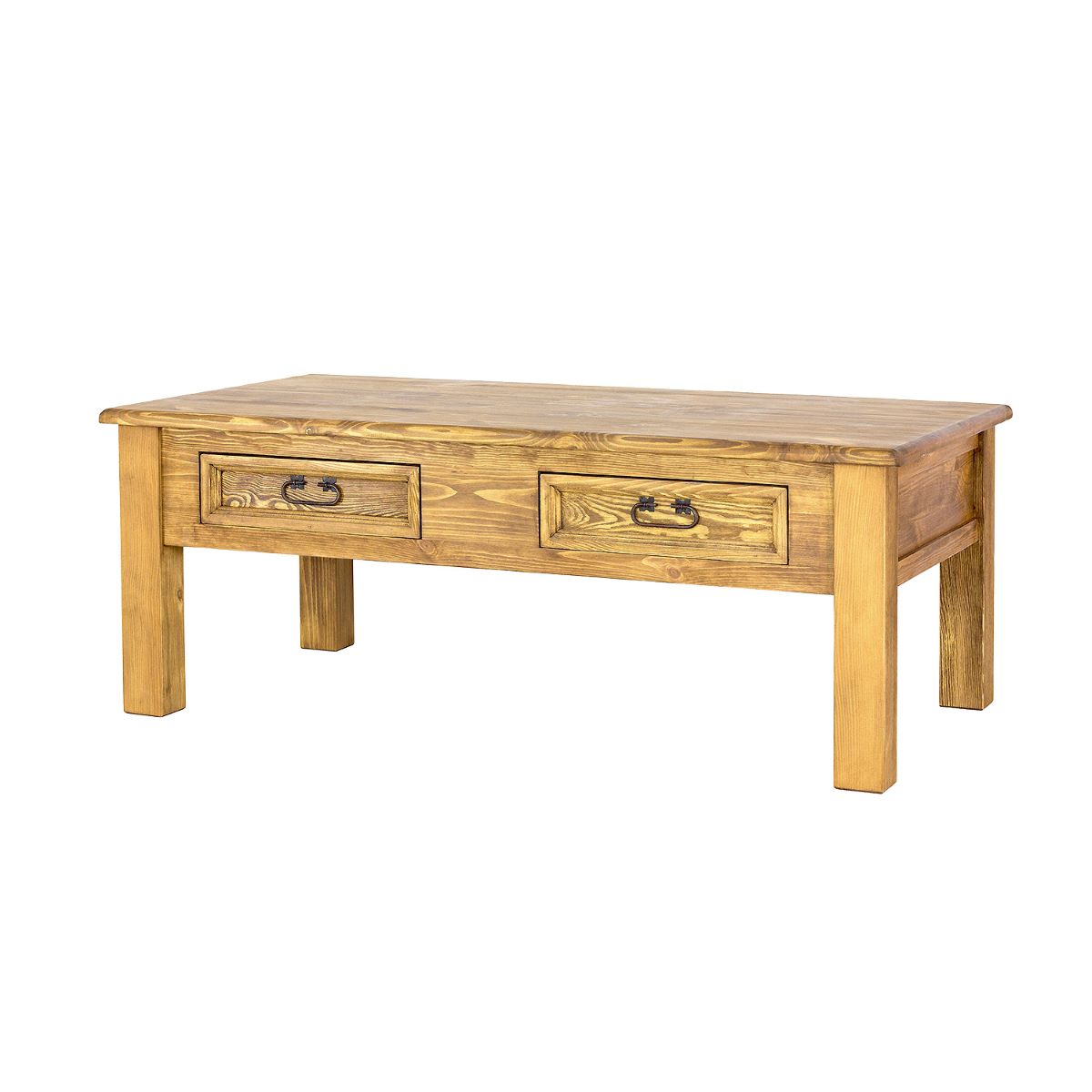 Voskovaný konferenčný stolík Rustik ST708 je vyrobený z masívneho borovicového dreva. Stane sa dominantov každej obývačky zariadenej v rustikálnom štýle. Vyznačuje sa ergonomickým tvarom a stabilnou konštrukciou. Stolík je vybavený hrubými rovnými nohami (8 x 8 cm) a dvoma zásuvkami, vysúvacími na drevených vodidlách. Pri výrobe boli použité ručne vyrobené kovové pánty a úchyty s efektom starnutia.Nábytok je pokrytý prírodným včelím voskom, ktorý vytvára ochrannú vrstvu proti vlhkosti, a zároveň sa stará o drevo. Vďaka ošetreniu voskovaním dokážeme zvýrazniť prirodzenú štruktúru dreva a prehĺbiť jeho prirodzenú farbu. Včelí vosk je prírodný produkt, voskovaný nábytok tak získava antistatické vlastnosti – menej sa na jeho povrchu usádza prach. Ďalšou výhodou voskovaného nábytku je jeho hodvábne hladký povrch a príjemná vôňa prírodného dreva.Rozmery (ŠxVxH): 135 x 52 x 75 cm.Nábytok dodávame zložený. V našej ponuke nájdete ďalšie prvky krásneho sektoru Rustik, vďaka ktorému si zariadite pracovňu, obývačku, či spálňu v jedinečnom štýle.