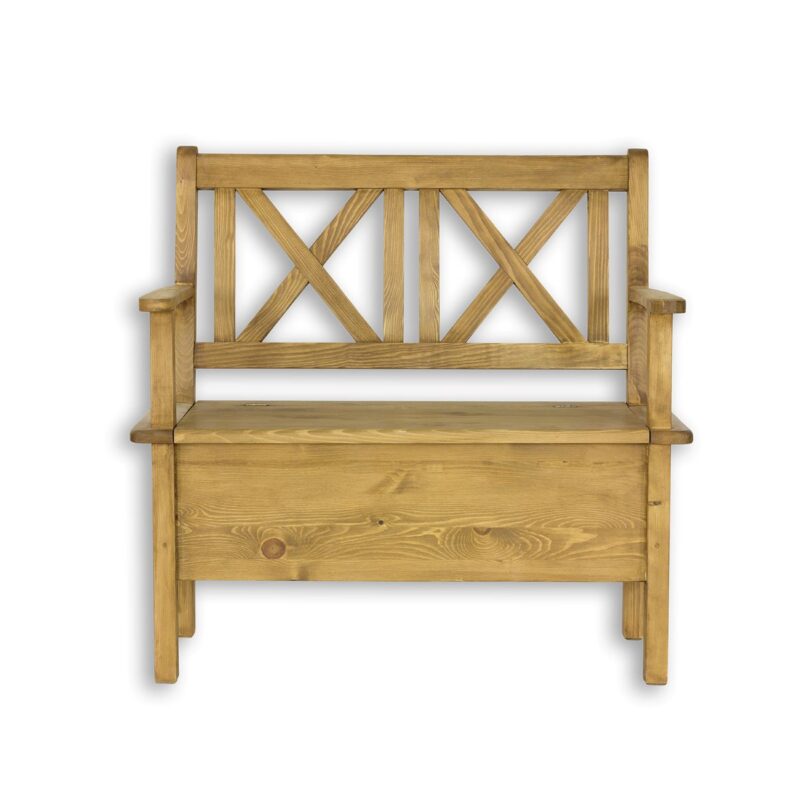 Voskovaná lavica s podrúčkami Rustik NR700 je vyrobená z masívneho borovicového dreva. Má originálne krížové operadlo a otváracie sedadlo s bohatým úložným priestorom. Ergonomické sedadlo je vybavené praktickými podrúčkami, vďaka ktorým sa používanie lavice stáva oveľa pohodlnejším. Nábytok je pokrytý prírodným včelím voskom, ktorý vytvára ochrannú vrstvu proti vlhkosti, a zároveň sa stará o drevo. Vďaka ošetreniu voskovaním dokážeme zvýrazniť prirodzenú štruktúru dreva a prehĺbiť jeho prirodzenú farbu. Včelí vosk je prírodný produkt, voskovaný nábytok tak získava antistatické vlastnosti – menej sa na jeho povrchu usádza prach. Ďalšou výhodou voskovaného nábytku je jeho hodvábne hladký povrch a príjemná vôňa prírodného dreva.Rozmery (ŠxVxH): 150 x 96 x 53 cm.Nábytok dodávame zložený.V našej ponuke nájdete ďalšie prvky krásneho sektoru Rustik, vďaka ktorému si zariadite pracovňu, obývačku, či spálňu v jedinečnom štýle.