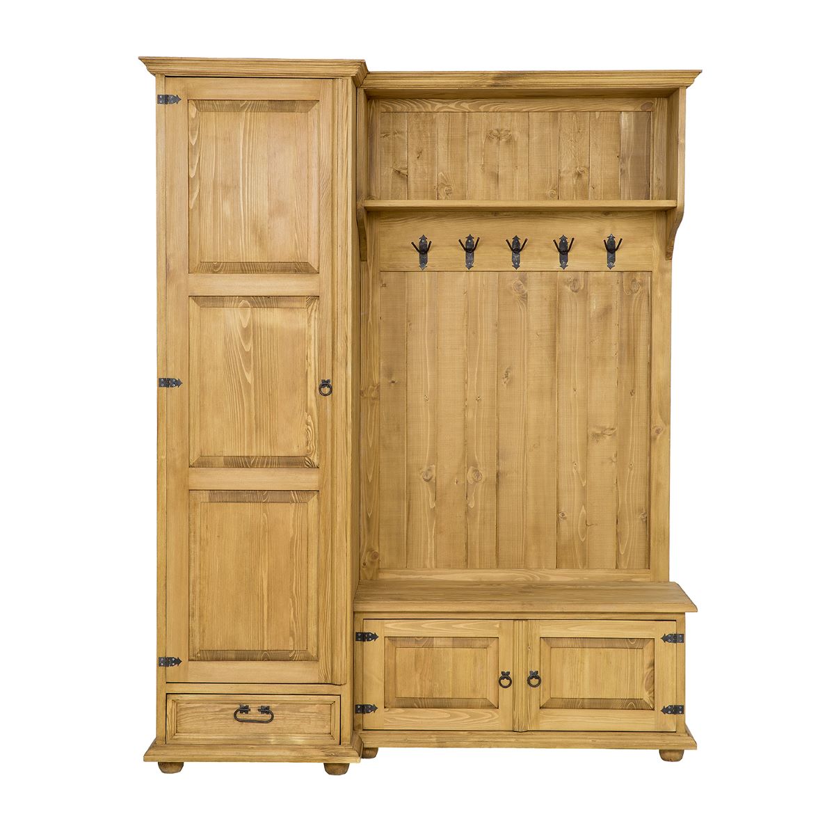 Zostava do predsiene Rustik GR704 je vyrobená výhradne z masívneho borovicového dreva. Skladá sa z dvoch častí, prvá z nich je tvorená jednodverovou skriňou s vešiakom zo zásuvkou, v druhej časti je odkladacia polica, pod ktorou sú vešiaky a v dolnej časti je praktická skrinka na topánky.Nábytok má odolnú a pevnú konštrukciu, pri výrobe boli použité kovové úchyty s efektom starnuta.Nábytok je pokrytý prírodným včelím voskom, ktorý vytvára ochrannú vrstvu proti vlhkosti, a zároveň sa stará o drevo. Vďaka ošetreniu voskovaním dokážeme zvýrazniť prirodzenú štruktúru dreva a prehĺbiť jeho prirodzenú farbu. Včelí vosk je prírodný produkt, voskovaný nábytok tak získava antistatické vlastnosti – menej sa na jeho povrchu usádza prach. Ďalšou výhodou voskovaného nábytku je jeho hodvábne hladký povrch a príjemná vôňa prírodného dreva.Rozmery: (ŠxVxH): 155 x 195 x 60/43 cm.Dodávame v demonte.V našej ponuke nájdete ďalšie prvky krásneho sektoru Rustik, vďaka ktorému si zariadite pracovňu, obývačku, či spálňu v jedinečnom štýle.