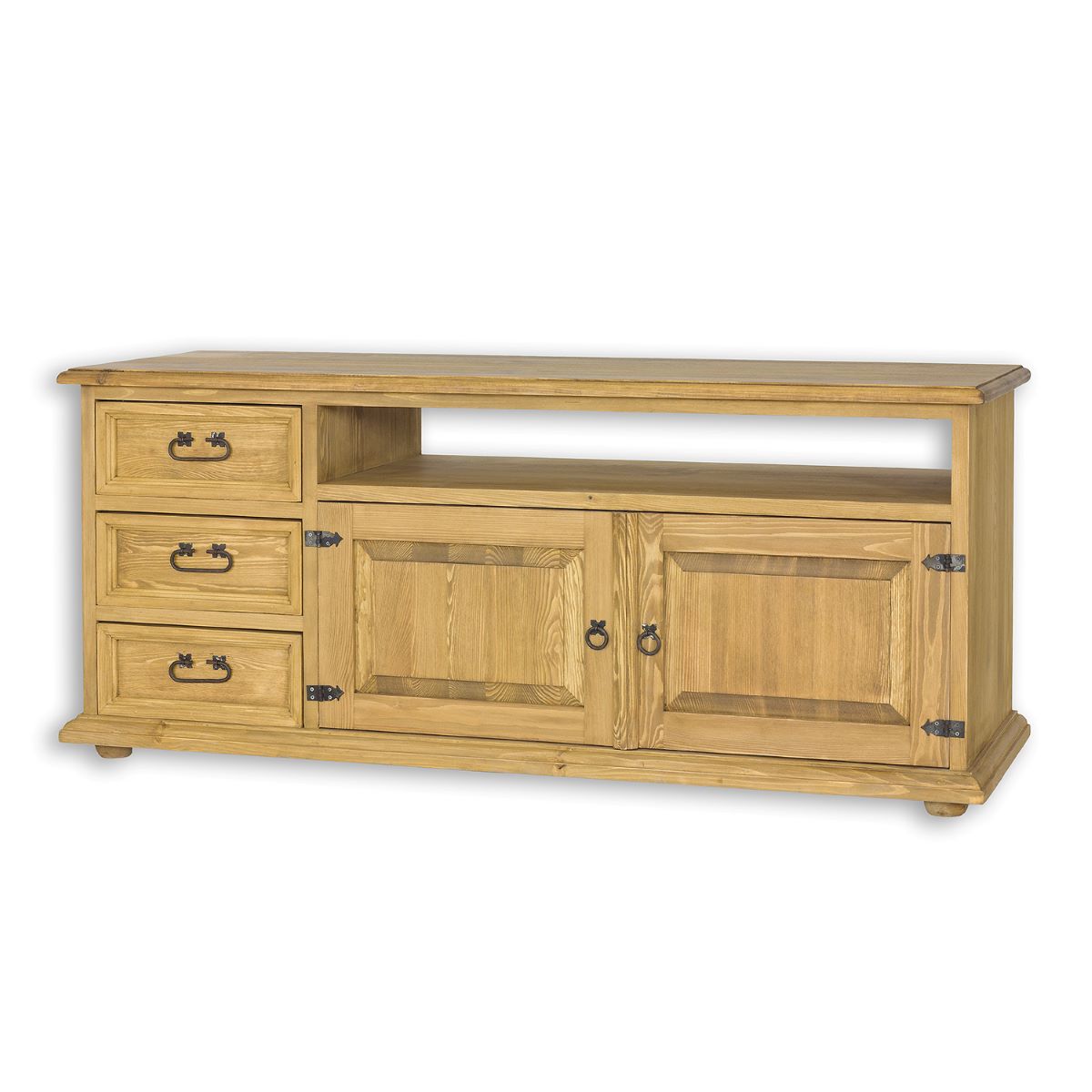 Voskovaná TV skrinka Rustik RV703 navrhnutá v rustikálnom štýle, celá vyrobená z masívneho borovicového dreva. Je uložená na drevených nožičkách v tvare guličiek. Disponuje tromi praktickými zásuvkami, ktoré sa vysúvajú na drevených vodidlách, vpravo je dvojdverová skrinka, nad ktorou sa nachádza odkladacia polica. Nábytok má odolnú a pevnú konštrukciu. Na výrobu boli použité ručne vyrobené kovové pánty a madlá s efektom starnutia. Skrinka dodá každému interiéru jedinečnú atmosféru, plnú tepla a rodinnej atmosféry.Nábytok je pokrytý prírodným včelím voskom, ktorý vytvára ochrannú vrstvu proti vlhkosti, a zároveň sa stará o drevo. Vďaka ošetreniu voskovaním dokážeme zvýrazniť prirodzenú štruktúru dreva a prehĺbiť jeho prirodzenú farbu. Včelí vosk je prírodný produkt, voskovaný nábytok tak získava antistatické vlastnosti – menej sa na jeho povrchu usádza prach. Ďalšou výhodou voskovaného nábytku je jeho hodvábne hladký povrch a príjemná vôňa prírodného dreva.Rozmery (ŠxVxH): 150 x 60 x 50 cm.Nábytok dodávame zložený. V našej ponuke nájdete ďalšie prvky krásneho sektoru Rustik, vďaka ktorému si zariadite pracovňu, obývačku, či spálňu v jedinečnom štýle.
