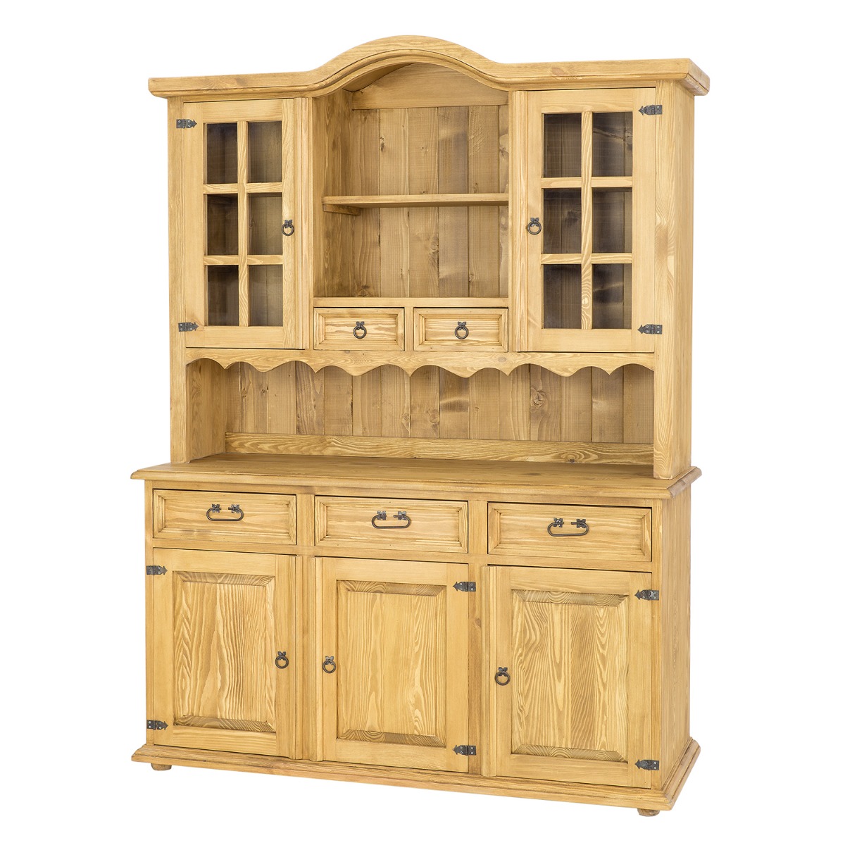 Kombinovaná voskovaná vitrína Rustik KW707 je navrhnutná v rustikálnom štýle a je vyrobená z masívneho borovicového dreva. Skladá sa z dvoch hlavných prvkov, komody a nástavca. V strede trojdverovej komody sa nachádza polica, nad ňou sú tri zásuvky na drevených vodidlách. Nadstavec pozostáva z dvoch presklených vonkajších dvierok, za ktorými sa nachádza polica. Medzi nimi sú dve zásuvky a odkladacie poilice. Horný nástavec je ukončený jednoduchým vencom.Nábytok má odolnú a pevnú konštrukciu. Pri výrobe boli použité ručne vyrobené kovové úchytky a pánty s efektom starnutia. Vitrína dodá každému interiéru jedinečnú atmosféru plnú tepla a útulnosti.Nábytok je pokrytý prírodným včelím voskom, ktorý vytvára ochrannú vrstvu proti vlhkosti, a zároveň sa stará o drevo. Vďaka ošetreniu voskovaním dokážeme zvýrazniť prirodzenú štruktúru dreva a prehĺbiť jeho prirodzenú farbu. Včelí vosk je prírodný produkt, voskovaný nábytok tak získava antistatické vlastnosti – menej sa na jeho povrchu usádza prach. Ďalšou výhodou voskovaného nábytku je jeho hodvábne hladký povrch a príjemná vôňa prírodného dreva.Rozmery (ŠxVxH): 150 x 205 x 56 cm.Nábytok dodávame zložený. V našej ponuke nájdete ďalšie prvky krásneho sektoru Rustik, vďaka ktorému si zariadite pracovňu, obývačku, či spálňu v jedinečnom štýle.