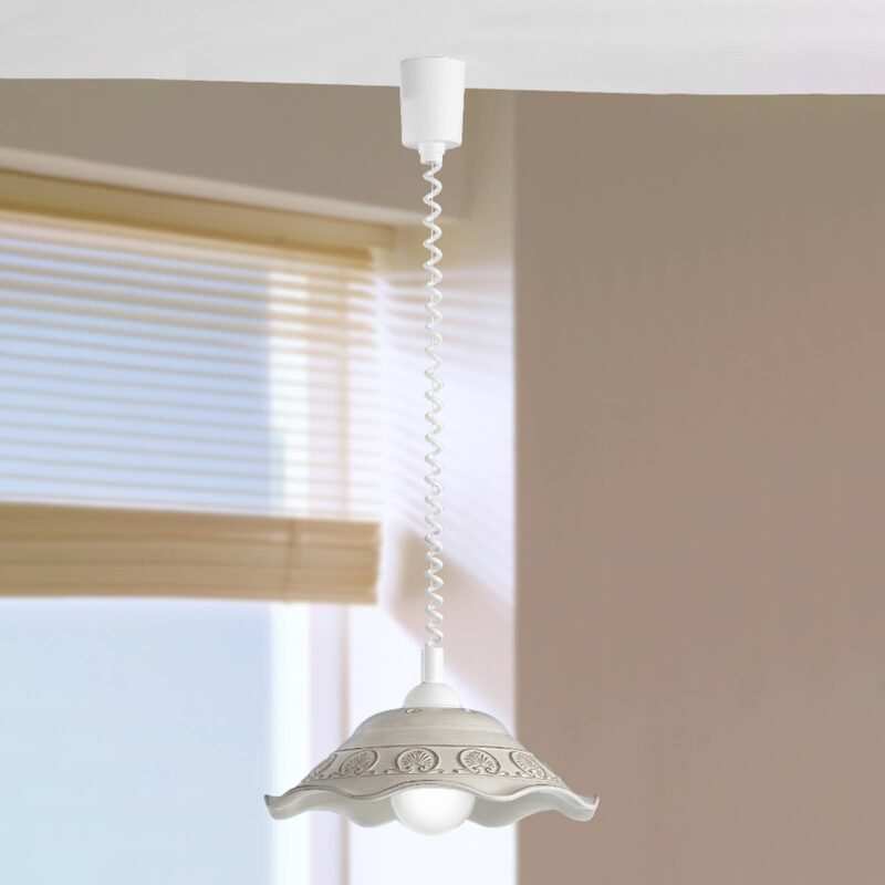 Rustikálne závesné svietidlo FRANCA s praktickým ťahovým závesomToto rustikálne závesné svietidlo so zvlneným okrajom je vybavené praktickým ťahovým závesom, vďaka ktorému ho možno v okamihu prispôsobiť okolnostiam a situáciám nad jedálenským stolom alebo v kuchyni. Rustikálne tienidlo je vyrobené z keramiky, ktorá podčiarkuje útulný vidiecky štýl závesnej lampy FRANCA. Nastaviteľná výška od 51 do 154 cm.