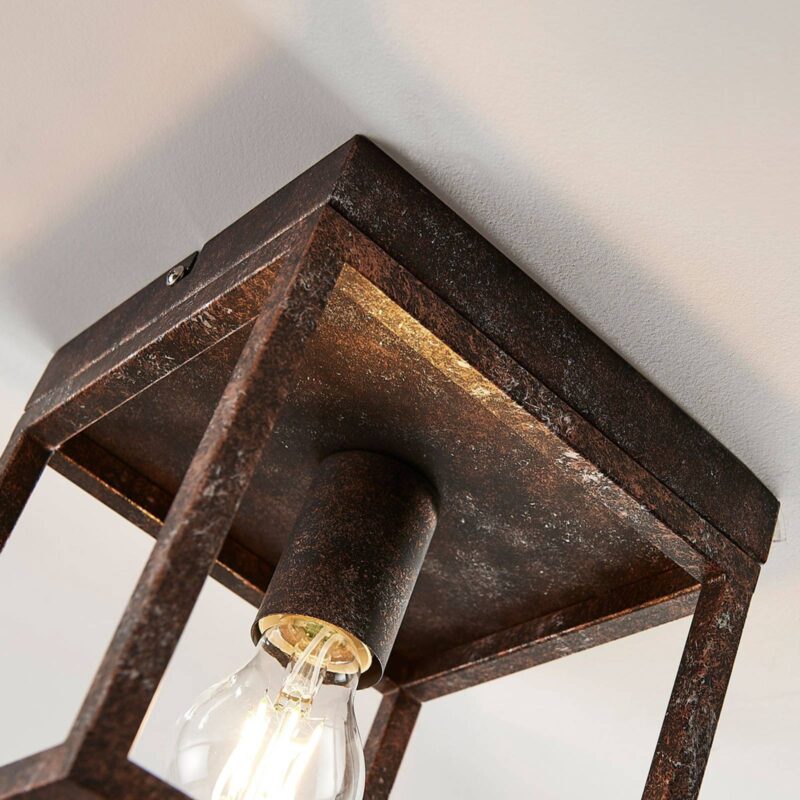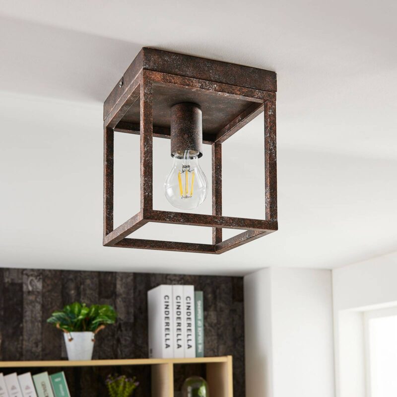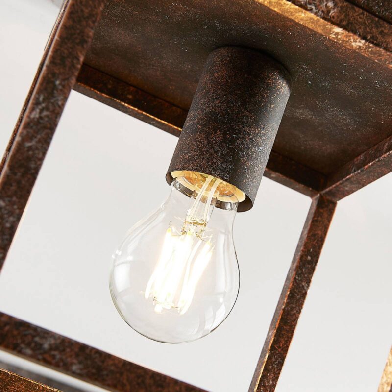 Hranaté stropné svietidlo Emin s jasne viditeľnou žiarovkou Emin sa skladá z trojrozmerného kovového rámu, ktorý si vystačí aj bez sklenených panelov. V kombinácii s krásnym hrdzavým povrchom je vytvorený starožitný vzhľad, ktorý vynikne v kombinácii s moderným interiérom. Nezáleží, kam svietidlo umiestnite. Jedno je isté: Žiarovka bude vždy jasne viditeľná. Preto by ste mali byť pri výbere žiarovky opatrní, aby zodpovedala celkovému vzhľadu svietidla. A čo by mohlo byť dokonalejšieho, ak ide o technológiu a vizuálnu príťažlivosť než LED žiarovky s technológiou viditeľných vlákien? Môžete si tiež vybrať žiarovky s rustikálnym vzhľadom, pretože tie tiež dopĺňajú starožitný vzhľad stropného svietidla.