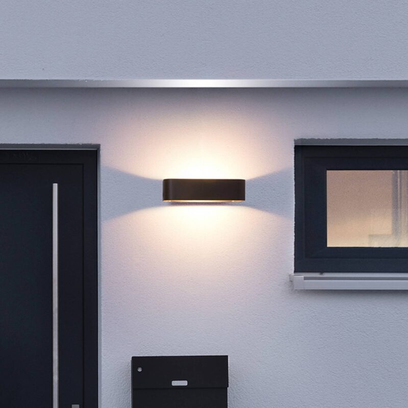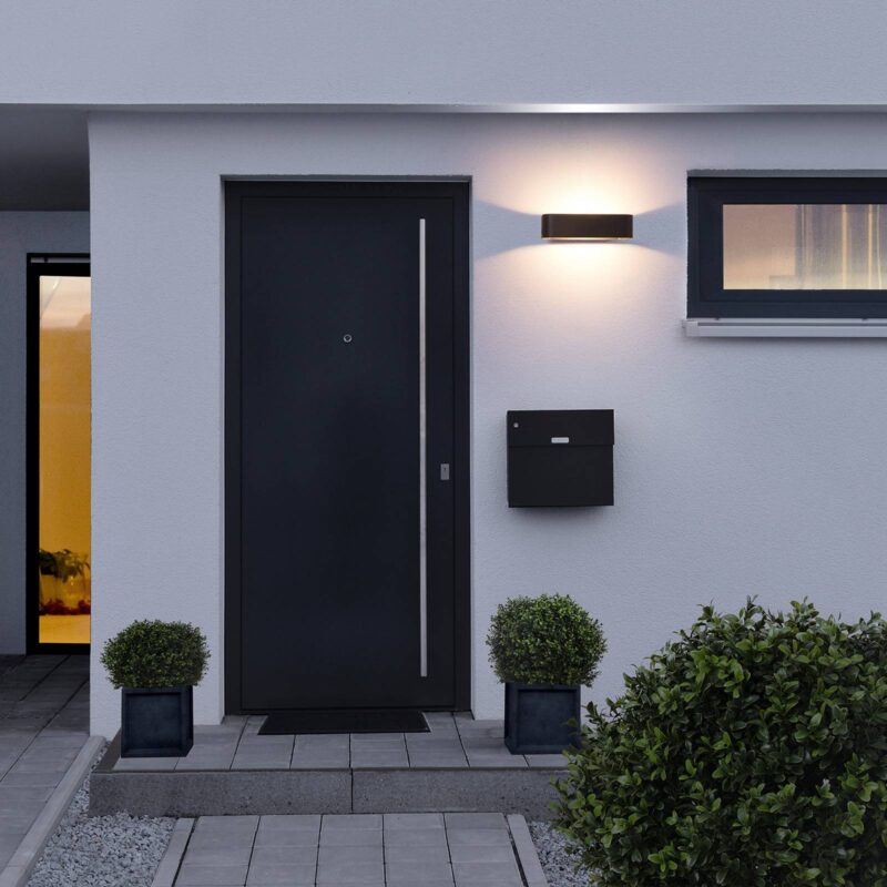 Vonkajšie nástenné svietidlo Cuboid LED HB 103 s nepriamym, vertikálnym vyžarovaním svetla Vonkajšie nástenné svietidlo HB 103 LED je ideálnou voľbou na nepriame osvetlenie pozdĺž fasády alebo vedľa vchodu v modernom prostredí. Svietidlo je vyrobené z tlakovo liateho hliníka s práškovým nástrekom v antracitovej metalickej farbe a má tvar širokého, spredu zaobleného kubusu, ktorý je otvorený v hornej a dolnej časti. LED diódy sú integrované za prednou časťou. Ich teplé biele svetlo vyžaruje na zadnú stranu a okolitú stenu, takže okolie je príjemne osvetlené bez oslnenia a na stene sa vytvára príťažlivý svetelný efekt. – Trieda ochrany: IP54 – Odolnosť proti nárazu: IK06 – s integrovaným ovládacím zariadením