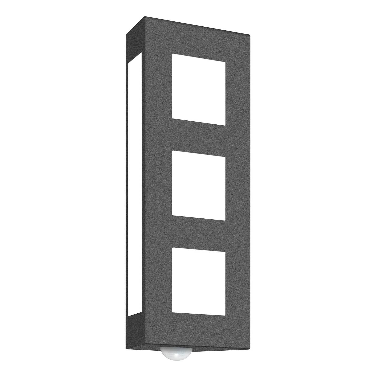 S detektorom pohybu – vonkajšie nástenné svietidlo Aqua Trilo v antracitovej farbeInštalácia nástenného svietidla s detektorom pohybu je výhodná najmä vo vstupných priestoroch, pretože každý návštevník je privítaný svetlom a môže bezpečne dosiahnuť dvere. Snímač rozpozná pohyb na vzdialenosť až 8 metrov a detekčný uhol 200°. Dĺžku svietenia je možné nastaviť (10 sekúnd až 8 minút). Svietidlo vyrobené z práškovo lakovanej nehrdzavejúcej ocele a opálového skla má dve pätice E27, v ktorých možno použiť žiarovky do 60 W alebo moderné LED žiarovky. Bočné strany tohto moderného vonkajšieho nástenného svietidla boli mierne sklonené smerom dozadu, aby sa vytvoril efekt nepriameho osvetlenia.