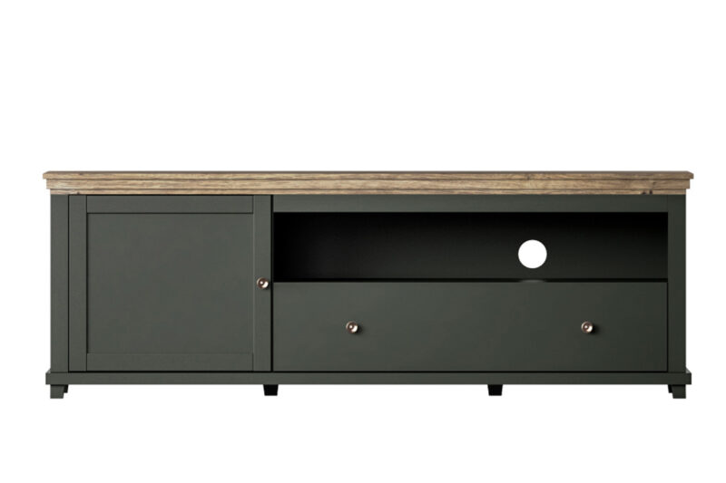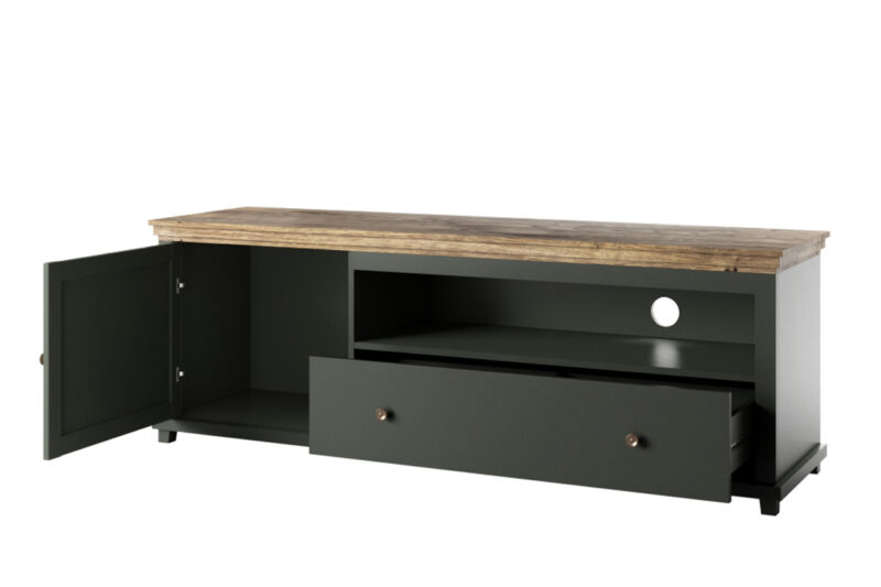 TV stolík SABRILA je súčasťou štýlového a elegantného sektoru SABRILA. Tento atraktívny sektor vynikajúco zapadne do klasického interiéru.  Zaujme a poteší najmä milovníkov elegancie. Nábytok je vhodný do obývačky, jedálne, pracovne a podobne.Stolík je jednodverový. Disponuje tiež praktickou zásuvkou a jednou otvorenou policou na uloženie DVD prehrávača a podobne.Korpus stolíka je vyrobený z LTD dosky, ktorá sa jednoducho udržiava. Predné časti sú vyrobené z MDF dosky, ktorá je potiahnutá kvalitnou fóliou. Tmavozelená farba v kombinácii s imitácou dreva dub lefkas vytvára mimoriadne štýlové spojenie farieb. Malé úchyty, ktoré sú v zlatom farebnom prevedení dodávajú nábytku SABRILA elegantný charakter.Rozmery (š,v,h): 181 x 61 x 49 cm.Dodávame v demontovanom stave.