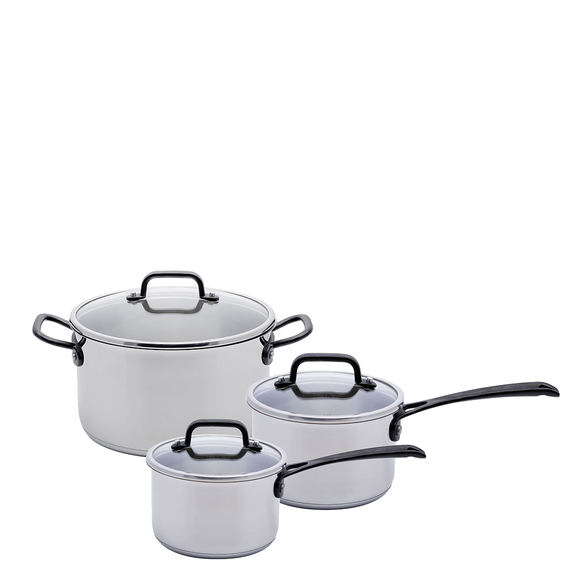Nadčasová sada hrncov z rady Premium bez problémov zvládne každodenné varenie a vyhovie požiadavkám náročným zákazníkom ako aj profesionálom. Lesklý povrch hrncov s profi rúčkami pôsobí moderne, zároveň elegantne a zabezpečuje štýlové varenie a servírovanie v jednom. Matný povrch so sendvičovým dnom vo vnútri zabezpečuje dokonalú reguláciu tepla. Súčasťou sady sú aj sklenené pokrievky s otvorom na uvoľnenie teplého vzduchu. Sada obsahuje: – 1x 1,5 l rajnica (priemer 16 cm, hĺbka 7,5 cm) + s 1x sklenenou pokrievkou – 1x 2,5 l rajnica (priemer 18 cm, hĺbka 8,5 cm) + s 1x sklenenou pokrievkou – 1x 6 l hrniec (priemer 24 cm, hĺbka 13,5 cm) + s 1x sklenenou pokrievkou