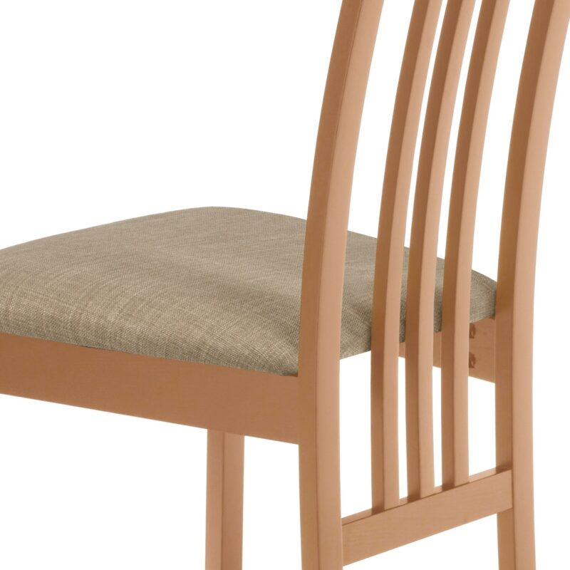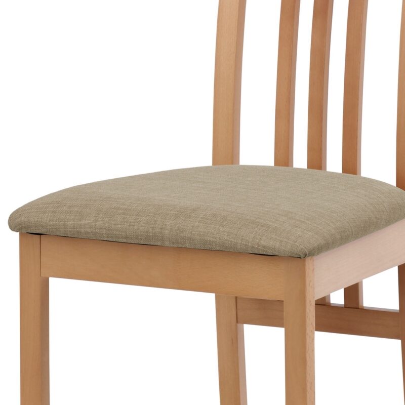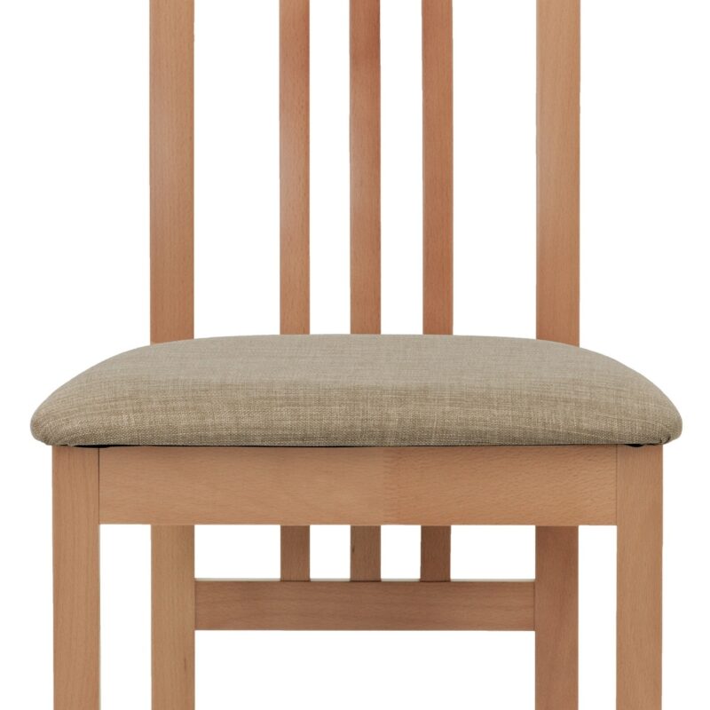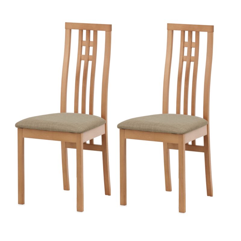 Táto sada 2 jedálenských stoličiek ponúka kombináciu jednoduchosti, elegancie, funkčnosti a klasického dizajnu. Konštrukcia z masívneho dreva v prírodnom odtieni pôsobí teplo a útulne, čím sa skvele hodí do tradičných aj moderných interiérov. Operadlo je jemne zakrivené a prispôsobené prirodzenému tvaru chrbta, čo zaručuje pohodlie aj pri dlhšom sedení. Mäkká čalúnená sedák je potiahnutá odolnou látkou v neutrálnom béžovo-hnedom odtieni, ktorá ľahko zapadne do rôznych farebných kombinácií interiéru. Použité materiály zaručujú dlhú životnosť a jednoduchú údržbu.Stoličky v tejto sade sú ideálne do kuchyne alebo jedálne – či už ako hlavné sedenie k jedálenskému stolu, alebo ako doplnkové stoličky pri väčších stretnutiach. Vďaka nadčasovému vzhľadu a kvalitnému spracovaniu sa stanú trvalou súčasťou vášho domova.Parametre a špecifikácie: