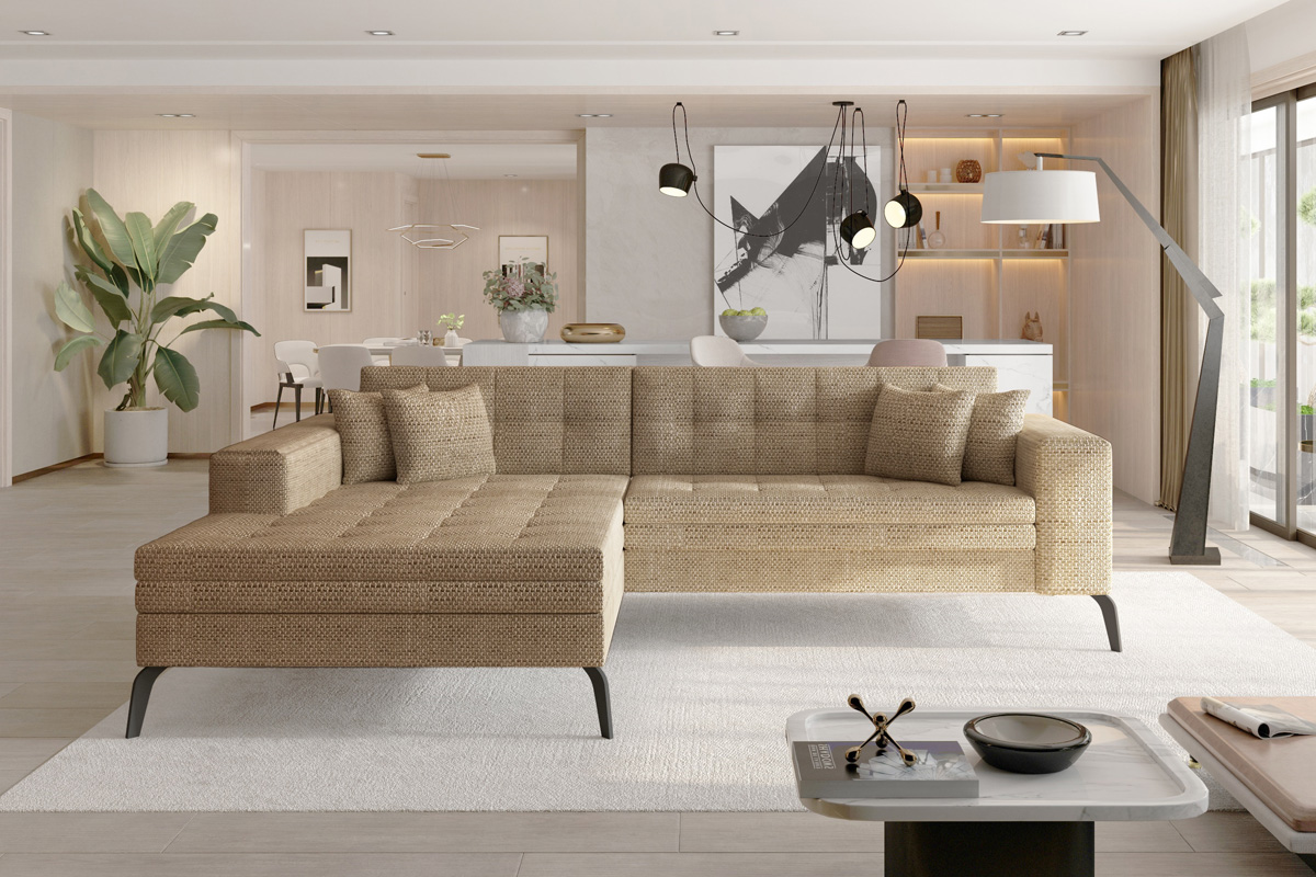 Sedačka SAFIN je moderný kus nábytku, ktorý sa stane štýlovým a dominantným prvkom vo Vašej obývačke. Ponúka trendové vysoké nožičky, ktoré v spojení s nízkymi opierkami vytvárajú efektný dizajn. Minimalistické prevedenie dodá miestnosti vzdušnosť a eleganciu. Oceníte aj možnosť rozkladu, vďaka čomu si vytvoríte luxusnú spaciu plochu 210 x 216 cm, vhodnú na príležitostné spanie. Automat typu Delfin zabezpečí jednoduchú manipuláciu pri rozklade sedačky. Sedacia časť je vyrobená z vlnovcovej pružiny, kombinovanej s PUR penou. Touto kombináciou získate pohodlný priestor pre sedenie či leňošenie. Hustota peny (sedadlo) T3040, hustota peny (operadlo) T2542.Sedačka je vyrobená v ľavom prevedení rohu. Je celočalúnená, vhodná aj na umiestnenie v priestore. Čalúnená je kvalitnou látkou Berlin 03. Nohy sú kovové, v čiernom farebnom prevedení. Súčasťou sedačky sú aj dekoračné vankúšiky vyobrazené na fotke. Celkové rozmery (š/v/h): 295 x 100 x 195 cm. Hĺbka sedenia 58 cm, výška sedenia 58 cm, výška nožičiek 20 cm.V našej ponuke nájdete túto sedačku aj v opačnom prevedení rohu ako aj v ďalších módnych a štýlových farbách.