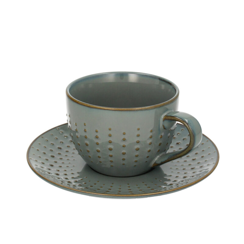 Šálka a podšálka Dossi s efektným dizajnom obohateným o originálny vzor. Šedomodrý odtieň v kombinácii s farbou starožitného zlata vytvára pozoruhodnú kombináciu. Jedinečná vypuklá štruktúra a jemne naznačený okraj oslovia milovníkov dobrého štýlu. Je ideálna ako šálka na kávu alebo na podávanie iných obľúbených horúcich nápojov.