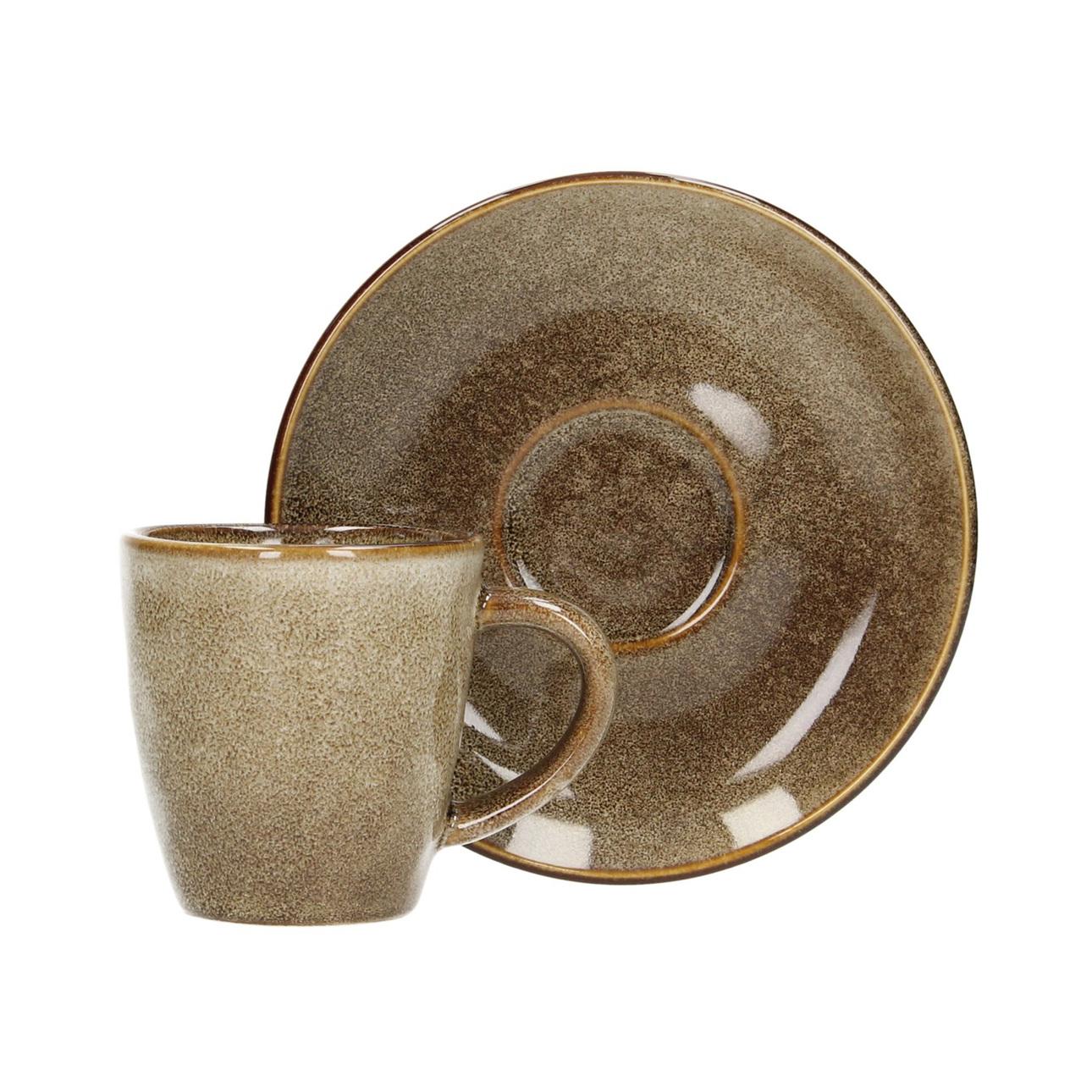 Keramická šálka s podšálkou v hnedej farbe.