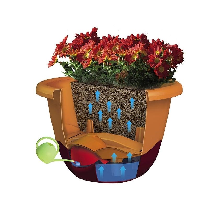 Samozavlažovací kvetináč je zložený z dvoch častí. Kvetináč je opatrený ukazovateľom stavu vody v kvetináči. Súčasťou kvetináča je aj kovový retiazka, ktorý umožní bezpečné zavesenie. Neobsahuje knôty. Knôty nie sú na pestovanie v tomto type kvetináče nutné.