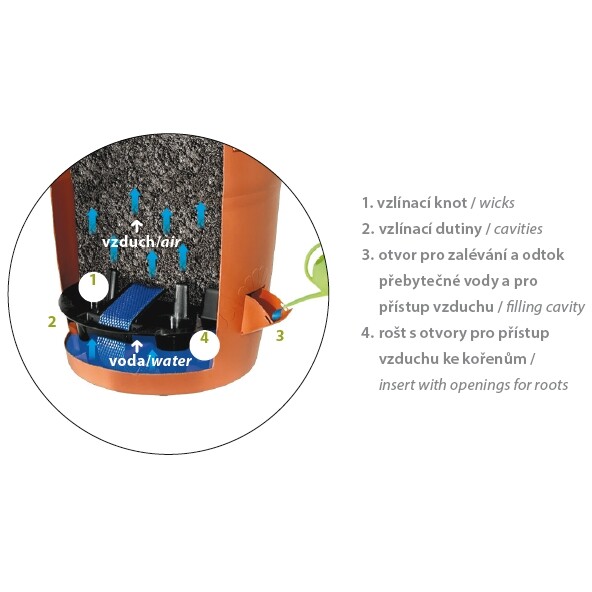 Táto praktická žardina je vhodná nielen pre všetky druhy letničiek, ale aj pre izbové kvetiny. Prístup vzduchu ku koreňom je zaistený “okienkom“, ktoré zároveň slúži na zalievanie kvetov. Voda sa drží v spodnej časti pod vložkou so vzlínajúcimi knôtom.