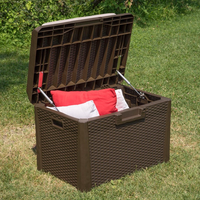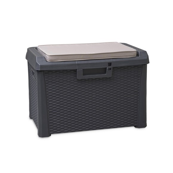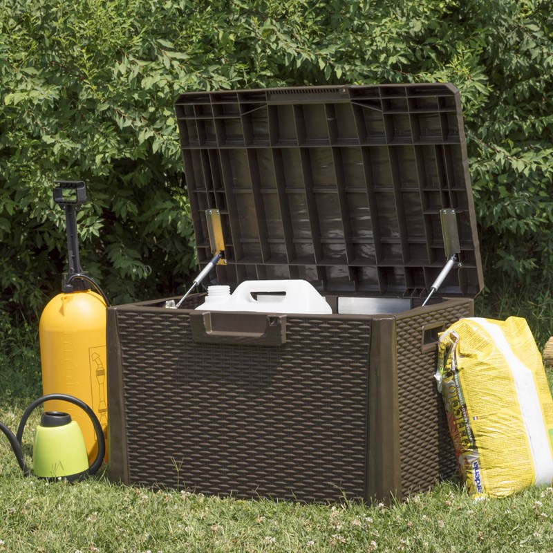 Záhradný úložný box, ktorý je vhodný ako do vnútorných, tak vonkajších priestorov. Odhadovaný čas na zostavenie boxu je 10 minút. Na zostavenie boxu je potreba základné náradie. Je vhodný aj na sedenie pre 1 osobu. Box obsahuje podsedák a pneumatický piest pre asistované otváranie a zatváranie. Možnosť umiestniť zámok.Box je vodeodolný, nie však vodotesný. Nemal by sa používať v zimnom období, plast môže v mrazoch skrehnúť a tým sa poškodiť.