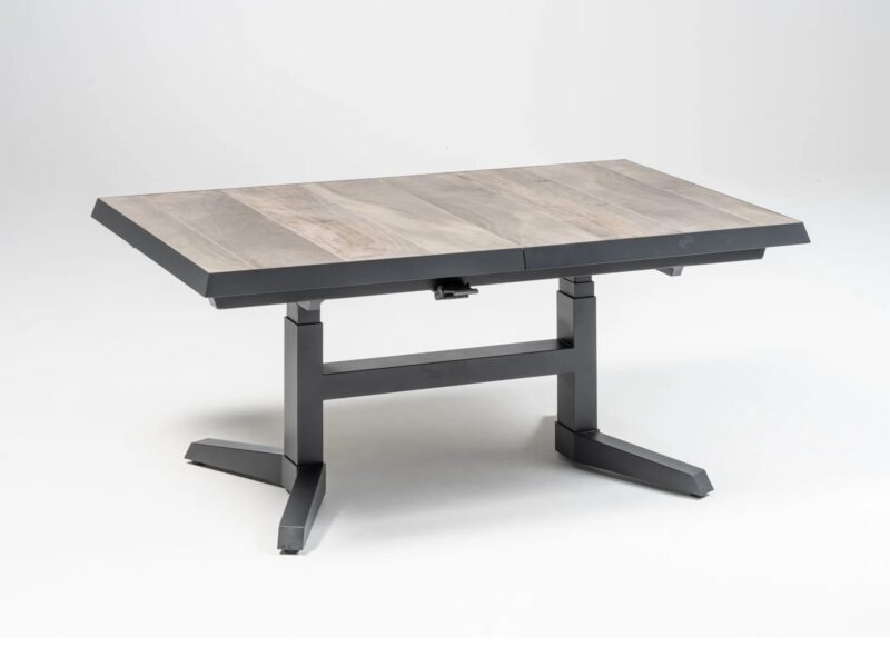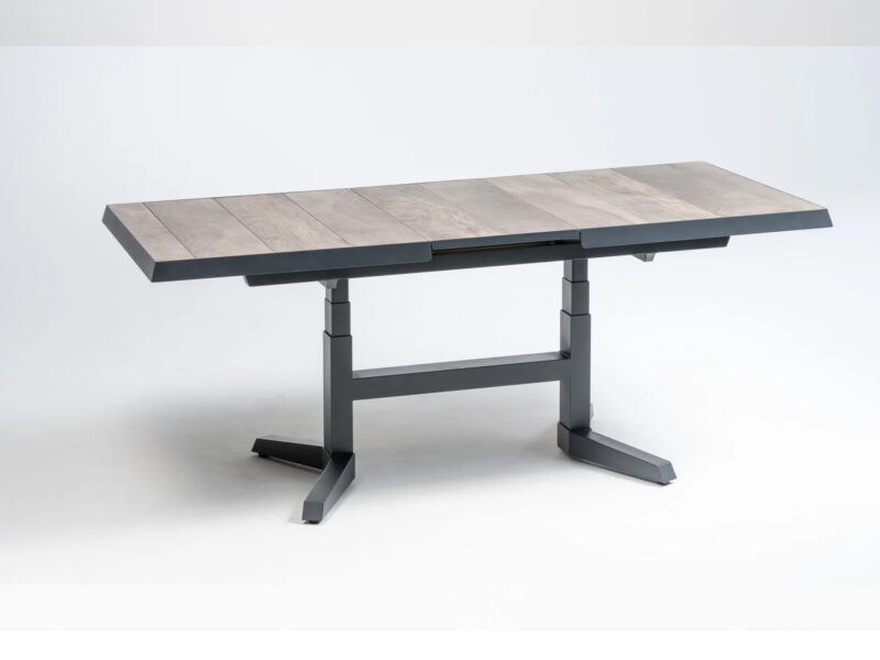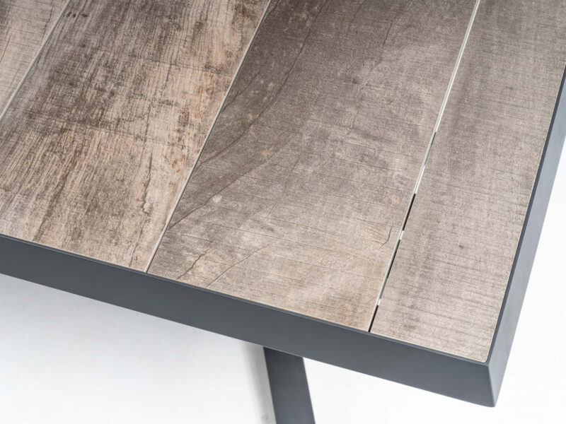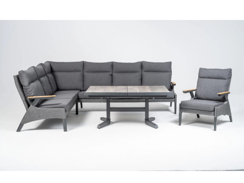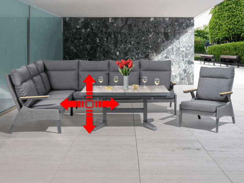 Rohová stolová súprava Santos ponúka pohodlné posedenie s praktickými funkciami. Výškovo nastaviteľný a rozkladací stôl s keramickou doskou vo vzhľade bridlice poskytuje dostatok priestoru. Pohodlné kreslá s nastaviteľným operadlom a vodoodpudivé poťahy zaisťujú komfort v každom počasí.
