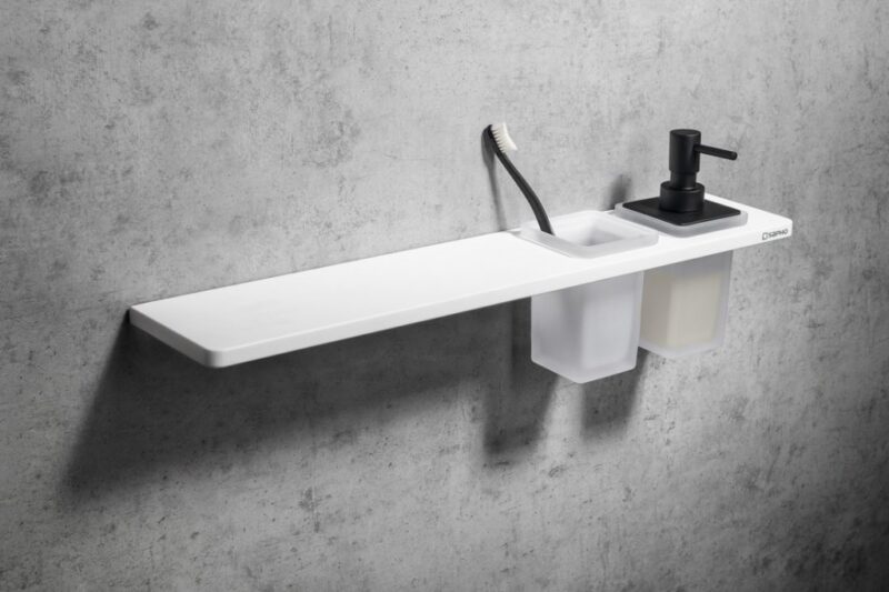 SAPHO – ABELINE polica, pohár + dávkovač/čierna, 1000, Rockstone, biela mat AE102-0101-03
