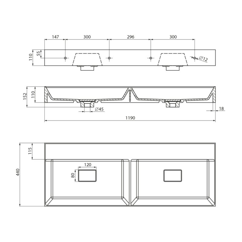SAPHO – GODIVA dvojité umývadlo, liatý mramor, 119x44cm, bez otvoru, biela GU119-0