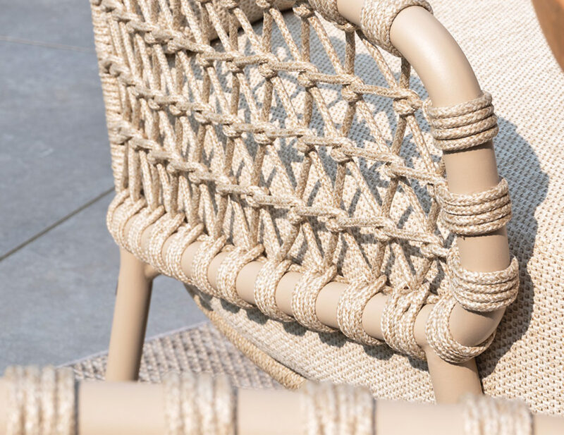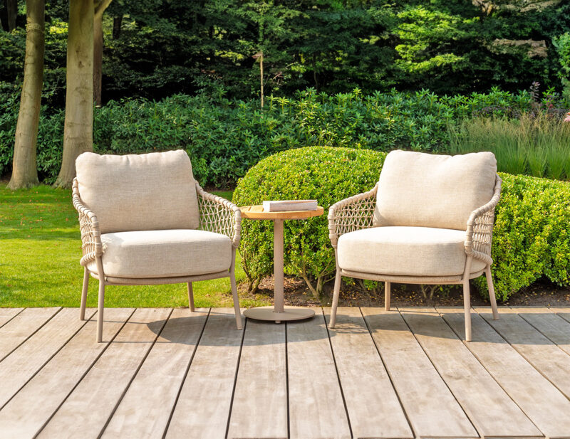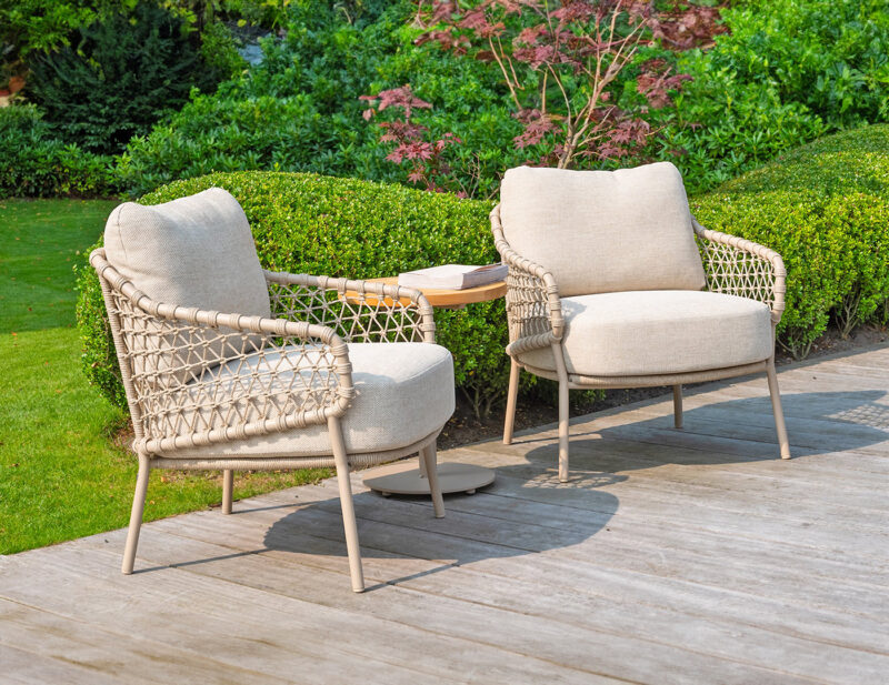 Sardinia Low balkónový set je štýlové a pohodlné riešenie pre menšie vonkajšie priestory. Obsahuje dve nízke jedálenské stoličky Sardinia Low s rope výpletom a hliníkovou konštrukciou a príručný stolík Boaz s keramickou doskou.